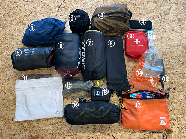 装備一覧:①レインジャケット Haglöfs L.I.M JK ②コッヘル+ガスバーナー:DUG POT M、SOTO WindMaster SOD-310 ③小物類(カトラリー、シェラカップ、ナイフ、ガストーチ、ヘッドライトなど) ④サングラス ⑤テントNordisk Lofoten 1 ULW ⑥寝袋NordiskOscar +1℃ ⑦マットNordisk Ven2.5 ⑧テーブルSOTOフィールドホッパーST-630 ⑨ファーストエイドキット ⑩歯ブラシ ⑪焚火台SORA Titanium Gear Super Naturestove#1 ⑫ペグ、ガイライン ⑬枕Qualzエアピロー ⑭水筒Platypusソフトボトル ⑮カメラDJI OSMO POCKET ⑯タープPaagoWorks Ninja Tarp ⑰サコッシュPOLeR 上記以外にSnow Peakライトタープポール150、Qualzライトスツール