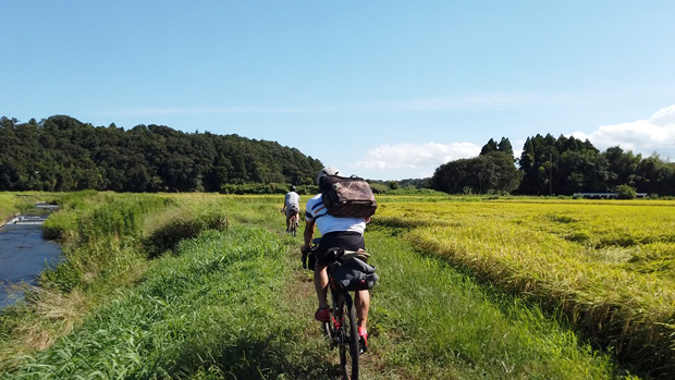 走り出しは交通量の少ない舗装路。陽炎揺らめくような熱風の中を走行。しかし程なくナビにしたがって脇道に入ると、緑濃い農道になった。するともう空気が違う! カラダをすり抜ける風が涼しくなった。次第にアスファルトの農道は砂利道に変わり、そのうち畦道になった。おそらく耕運機や軽トラがつけたであろう轍(わだち)は、細くて、路面も凹凸、草もぼうぼう生えているが、グラベルバイクだとなんの不安もない。それに眼前に広がる風景はなんだ! 市街地から10kmほどしか離れていないのに、トトロのオープニングのような夏の田園風景。