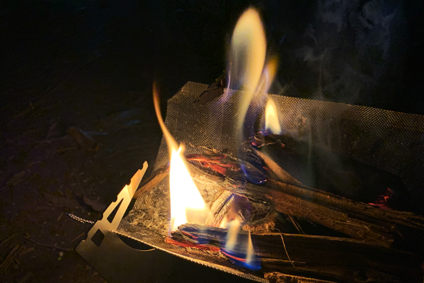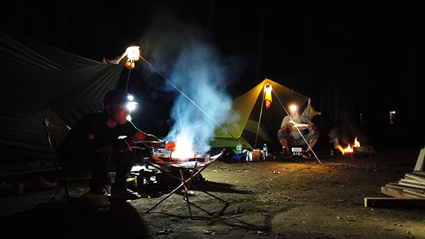 それから近くのスーパーに食材や飲み物を買い出しに行った。今回のテーマは個食個泊。食べ物や飲み物はシェアしないルールだ。思い思いに食材を買って調理する。料理のお裾分けもしないし、飲み物も別々、もちろん焚き火も個々にやる。平日ということもあって人も少なく、ある程度離れていても話ができるほど静か。おのおの火をいじりながら酒も進み、夜も更けていった。