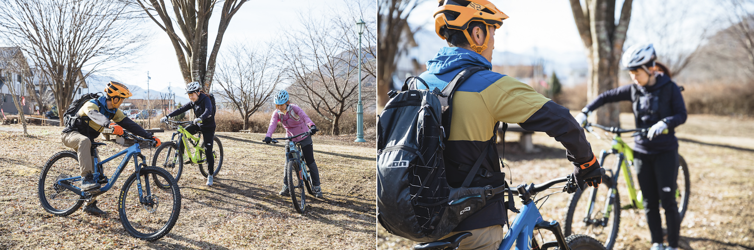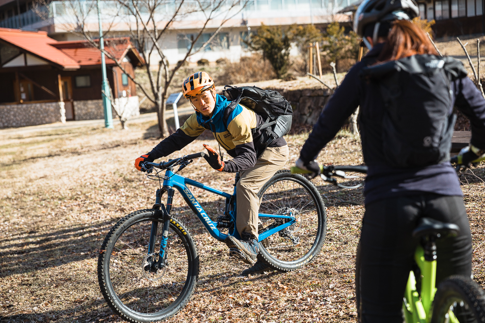 さっそくバイクにまたがって、まずは平らなところでマウンテンバイクの基本レクチャーから。初歩的だけど案外聞かないとわからない、乗り方、降り方、ブレーキのかけ方。同じ自転車でもママチャリ、クロスバイク、グラベルバイク、いままで乗ってきたものとも違う。山の中の不整地で乗るから、使い方をしっかり覚える。