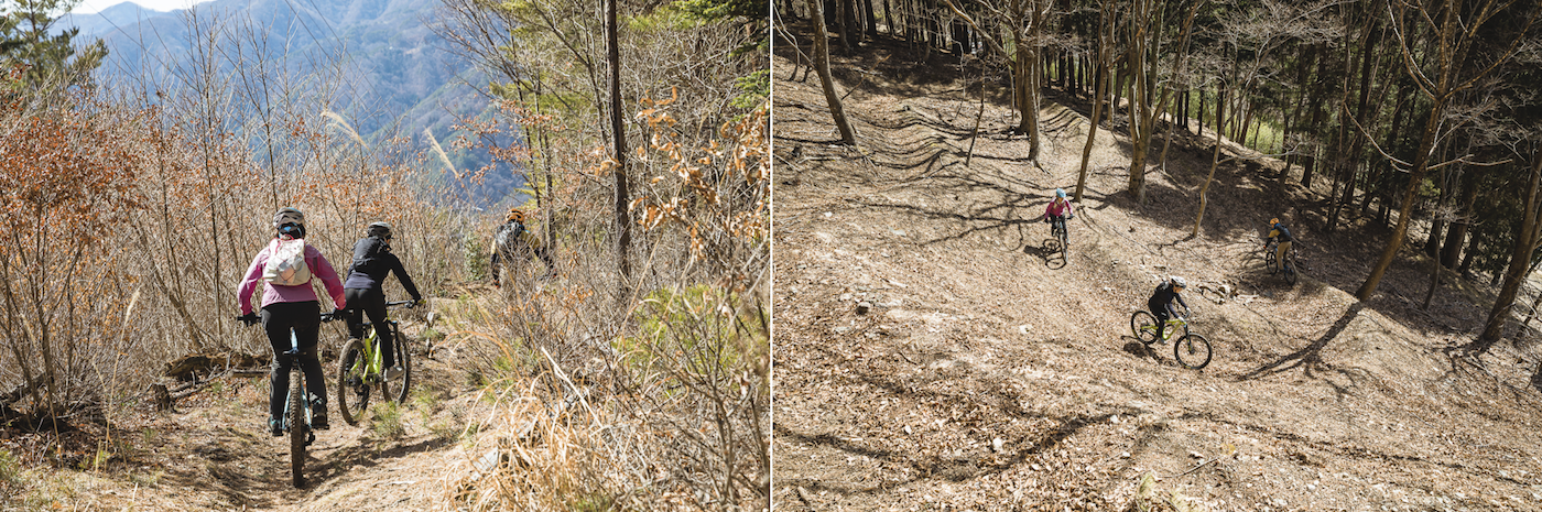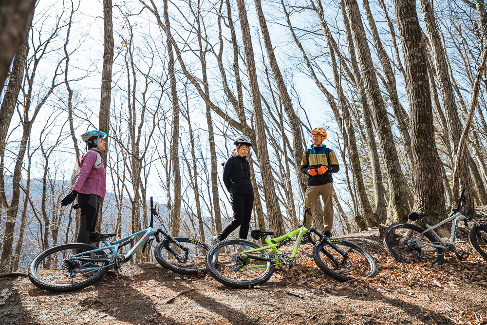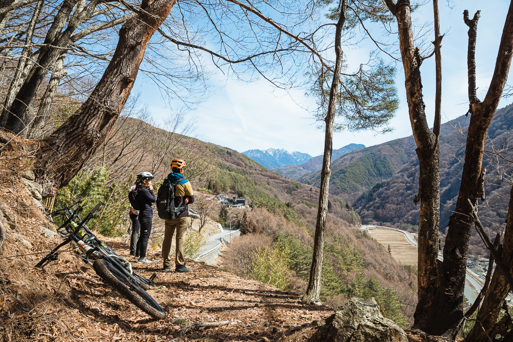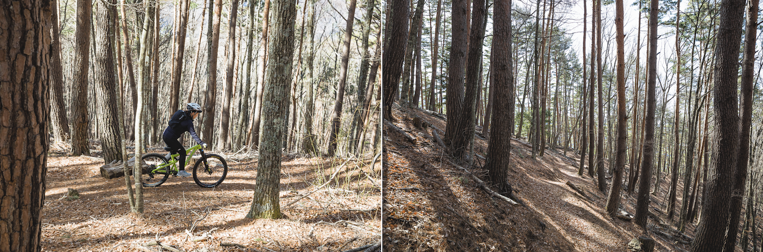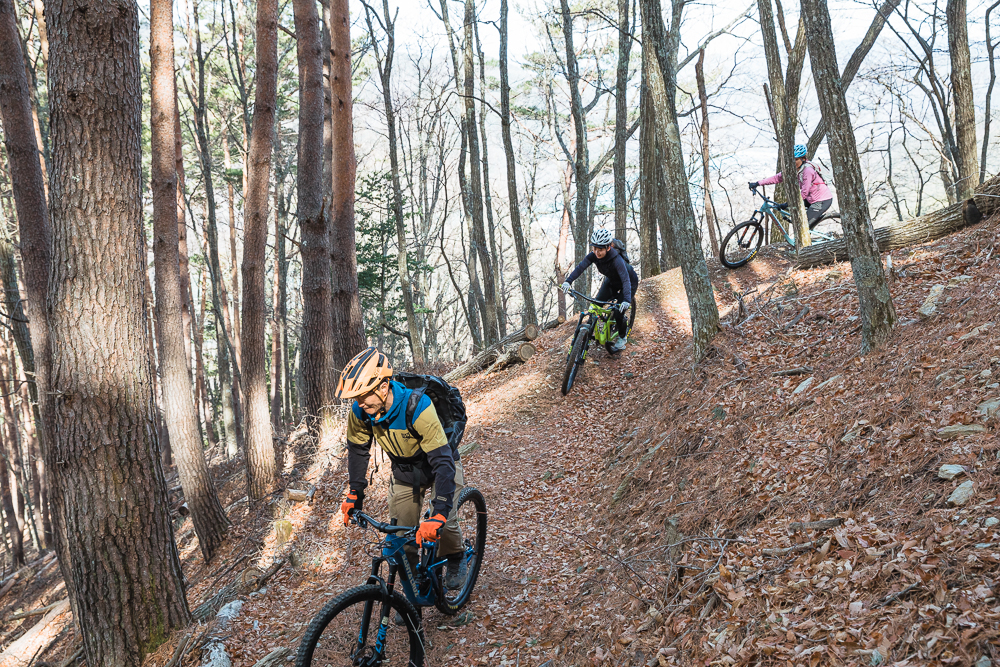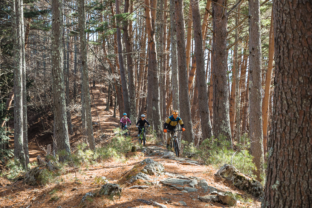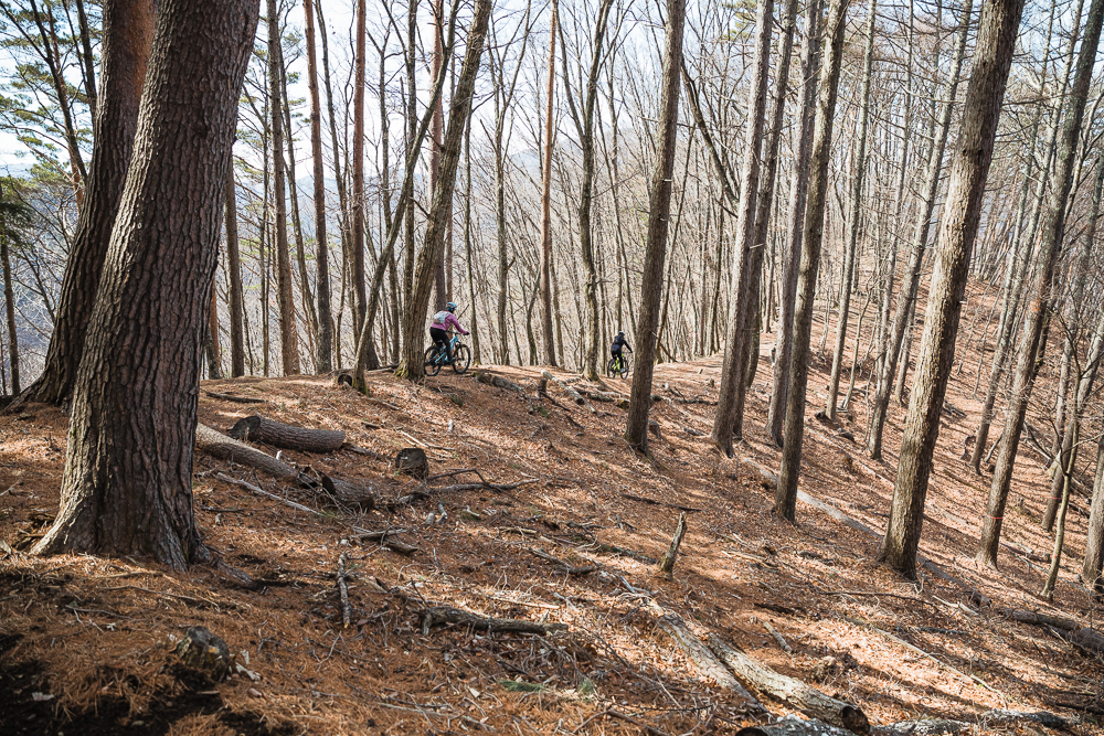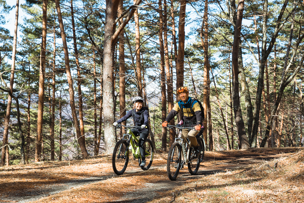 伊那エリアで、かつて麓の人々が山に入るために使用した古道を整備再生し、独自のアレンジを加えたコース。初級者から上級者まで幅広く楽しめるバリエーション豊かなトレイルは、総距離80kmという壮大さ! 伊那でマウンテンバイクのツアーをはじめてもう12年になるという。それだけの長い間、森を整備して安全に楽しめるようにみなさんが汗を流しているという話を聞くと、安心感と信頼感がグッと増す。