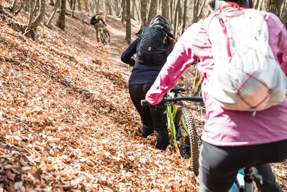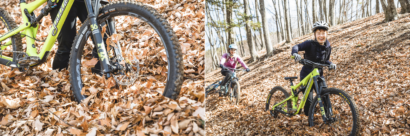 漕いで!漕いで!と言われたのにアッサリ足を着くわたし。そして下りる。そして押す。なんと、膝下まで埋まる枯葉の膝パウ! どうやって行ったのか謎すぎる! 本当はマウンテンバイクならこのくらいの枯葉がホイールにはさまったところでまったく問題なし。ガンガン行けちゃうのだ。めちゃくちゃよいバイクを借りているんだから思い切っていけばよかった!(本来なら整備で枯葉は避けているけれど、この日はマウンテンバイクツアーのシーズン前に取材させてもらったのでいつもより増してアドベンチャーだったらしい)