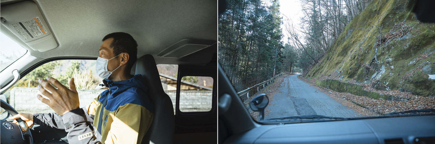 さて、それぞれのマウンテンバイクを車に積み込んで出発! 今日のマウンテンバイク体験は、名取さんが最初から最後まで一緒に案内してくれるガイドツアー。長~い峠道は車でズンズン、スタート地点まで連れていってもらえるのだ。麓から漕いで、山の中に入る前にクタクタなんてこともなし!