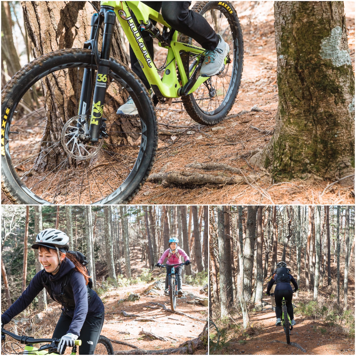習ったポジションはどこへやら。下りの勢いにびっくりしてブレーキギューギュー、全身ガッチガチ! 隣の隣の山くらいまで聞こえんじゃないかっていうくらいの大声で叫び倒し、テクニカルな岩のある部分はほんの少しだったけど、トレイルを必死の形相で越える。めちゃめちゃ小さい石っころも、小指くらいの枝も、想像以上にタイヤを取られるので、とにかくスリル満点!