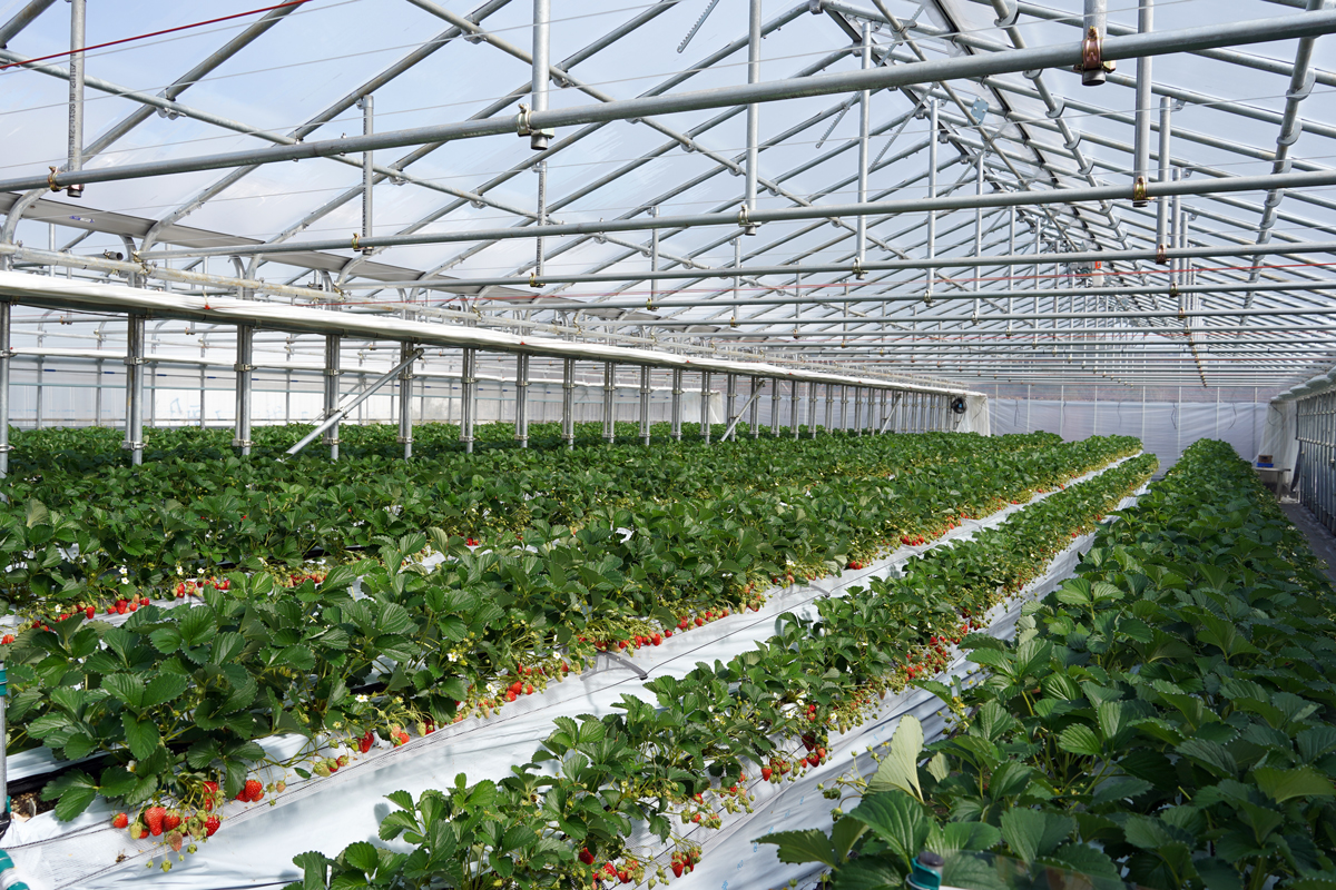 広いビニールハウスには何本もの畝があり、すでにたくさんのいちごたちが実をつけています。
