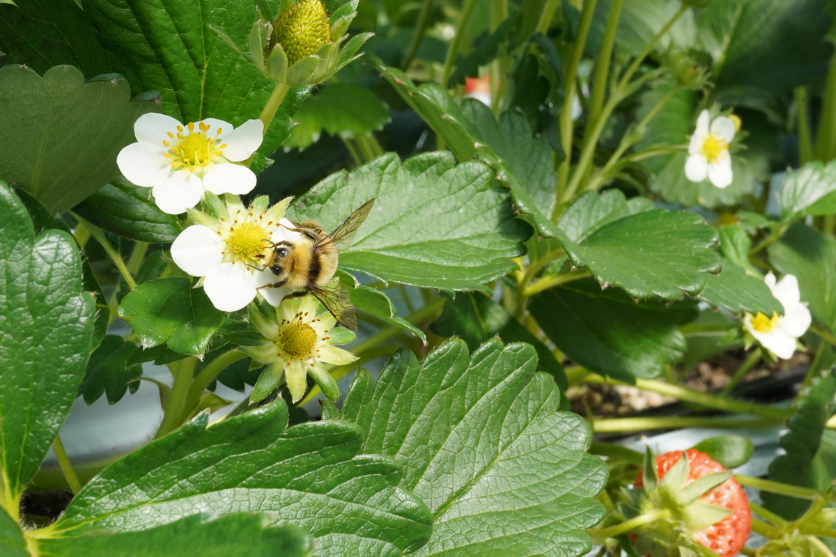 夢中でパクパクしている周りでは、蜂たちが花から花へと飛び回っています。この子たちの動きが受粉を手伝って、おいしいいちごを実らせるんですね。ご苦労様です。