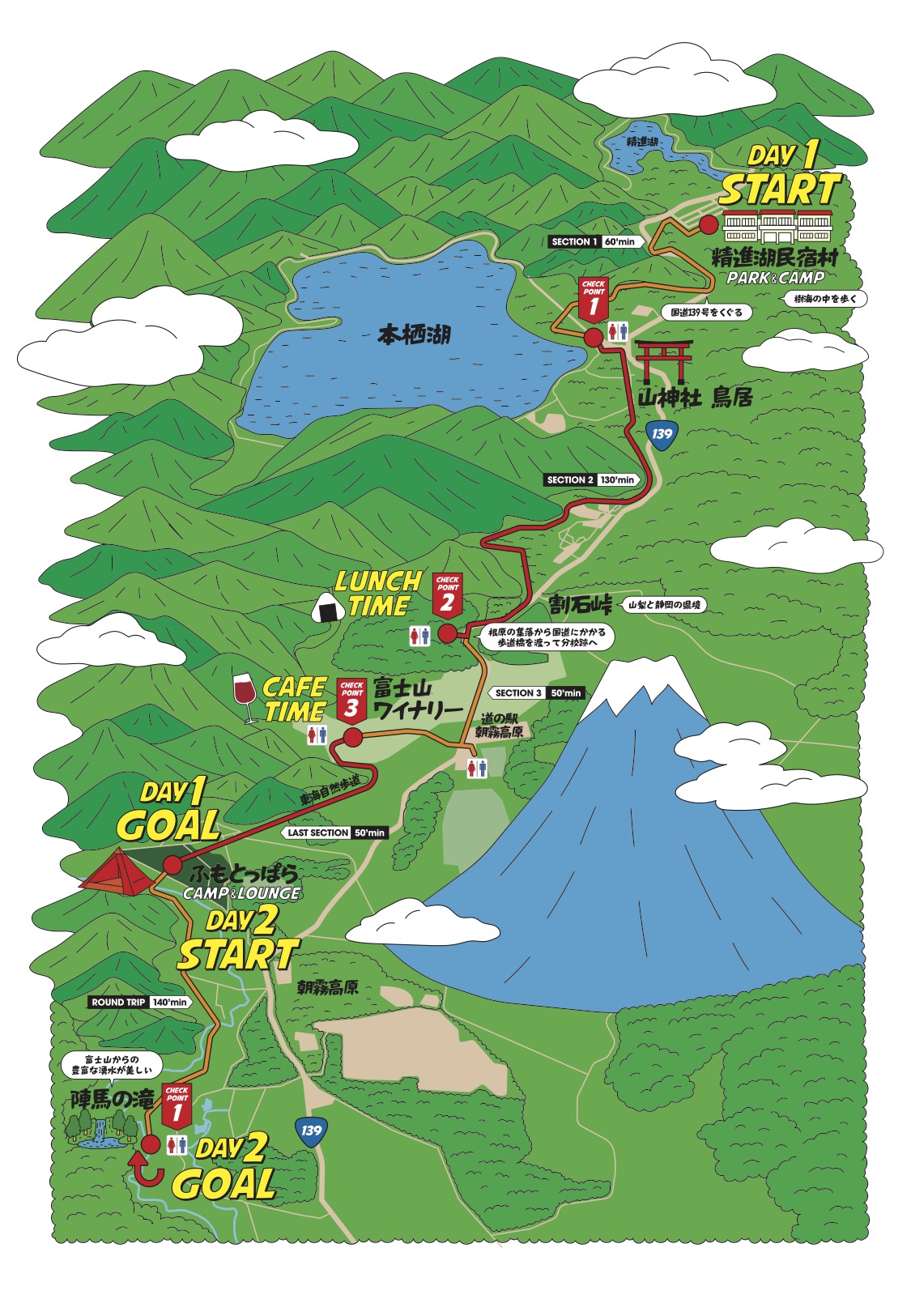 ルートは東海自然歩道の一部、富士五湖から幻想的な樹海をぬけ、雄大な富士山を仰ぎ見る聖地ふもとっぱらキャンプ場まで、高低差の少ない約20kmを2日にわけて歩きます。東海自然歩道とは、東京都八王子市の「明治の森高尾国定公園」から大阪府箕面市「明治の森箕面国定公園」までを結ぶ、総延長1800km、全22区間に及ぶ日本屈指の長距離自然歩道です。