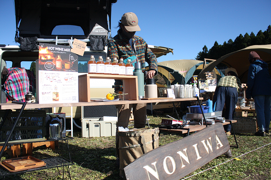 キャンプ民泊「NONIWA」を運営する野あそび夫婦。オリジナルのホットワインミックスを販売してました