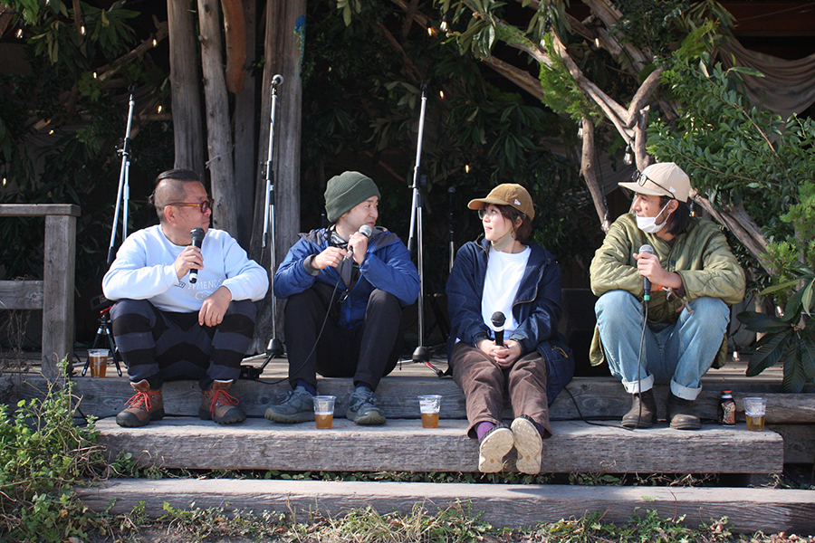 ゲストによるトークショーも開催。こちらはアウトドアゲストのトークショー。出演者は左からCielBleuのワカさん、低山小道具研究家の森勝さん、イラストレーターでキャンプコーディネーターのこいしゆうかさん、そして焚き火マイスターの猪野正哉さん