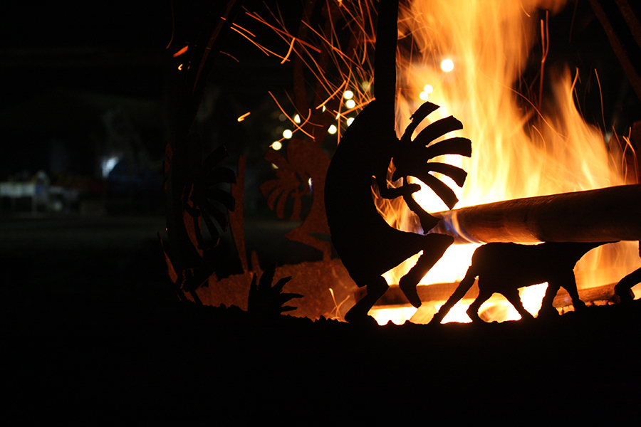 焚き火マイスター猪野正哉さんプロデュースによる焚き火。焚き火台のフチにかたどられたシルエットが影絵劇のワンシーンのよう