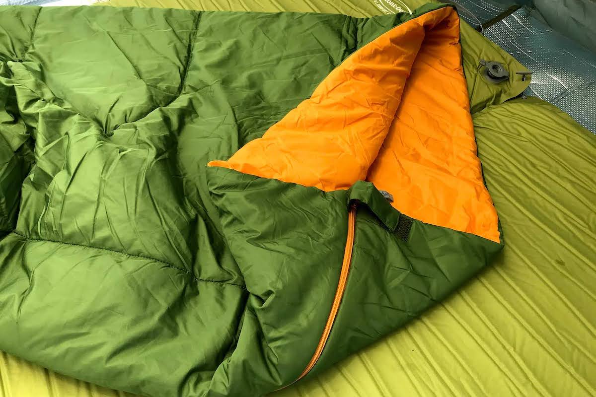 封筒型シュラフは広げると四角形の布団のようになるので、暑い日は1枚を敷布団として、もう1枚はかけ布団として利用する。寝返りしやすく、足先も出すことができるので、体温調節もしやすくて便利なのだ。