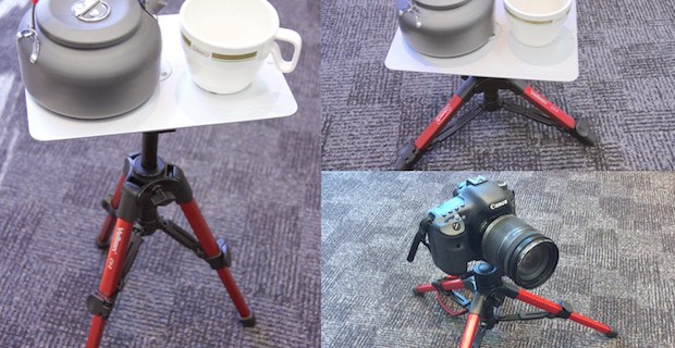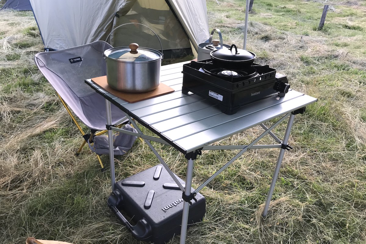 大人用は、子どもの火傷防止を考慮して、高さのあるテーブルにガスコンロを置いて調理をしている。これは以前、夫婦のキャンプで食事をするときに愛用していたもの。家族4人で食事をするのには小さいけれど、作業台として利用するのに丁度よい大きさで、軽量かつコンパクトに収納できるので持ち運びしやすい。