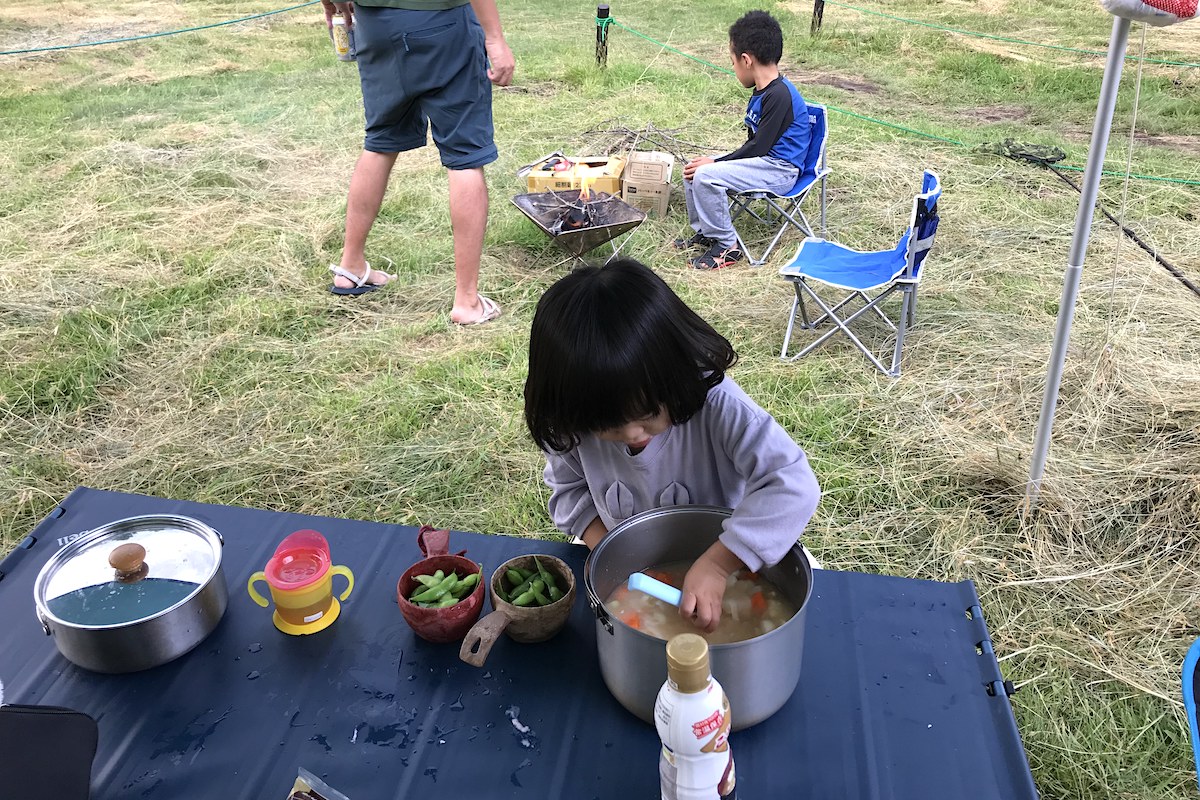 事前に浸水させておいたお米をガスコンロで炊いていたころ、混ぜることが楽しくなった娘がほかにも混ぜたいとアピールをしてきた。そこで豚汁用の鍋と、事前に自宅で切っておいた野菜が入ったタッパーを渡した。野菜は食べやすい大きさに切って持参すると調理の手間が省けるのでおすすめ。ペットボトルの水を注いで、ぐるぐる混ぜながら満足そうな表情をしている姿がとてもかわいかった。