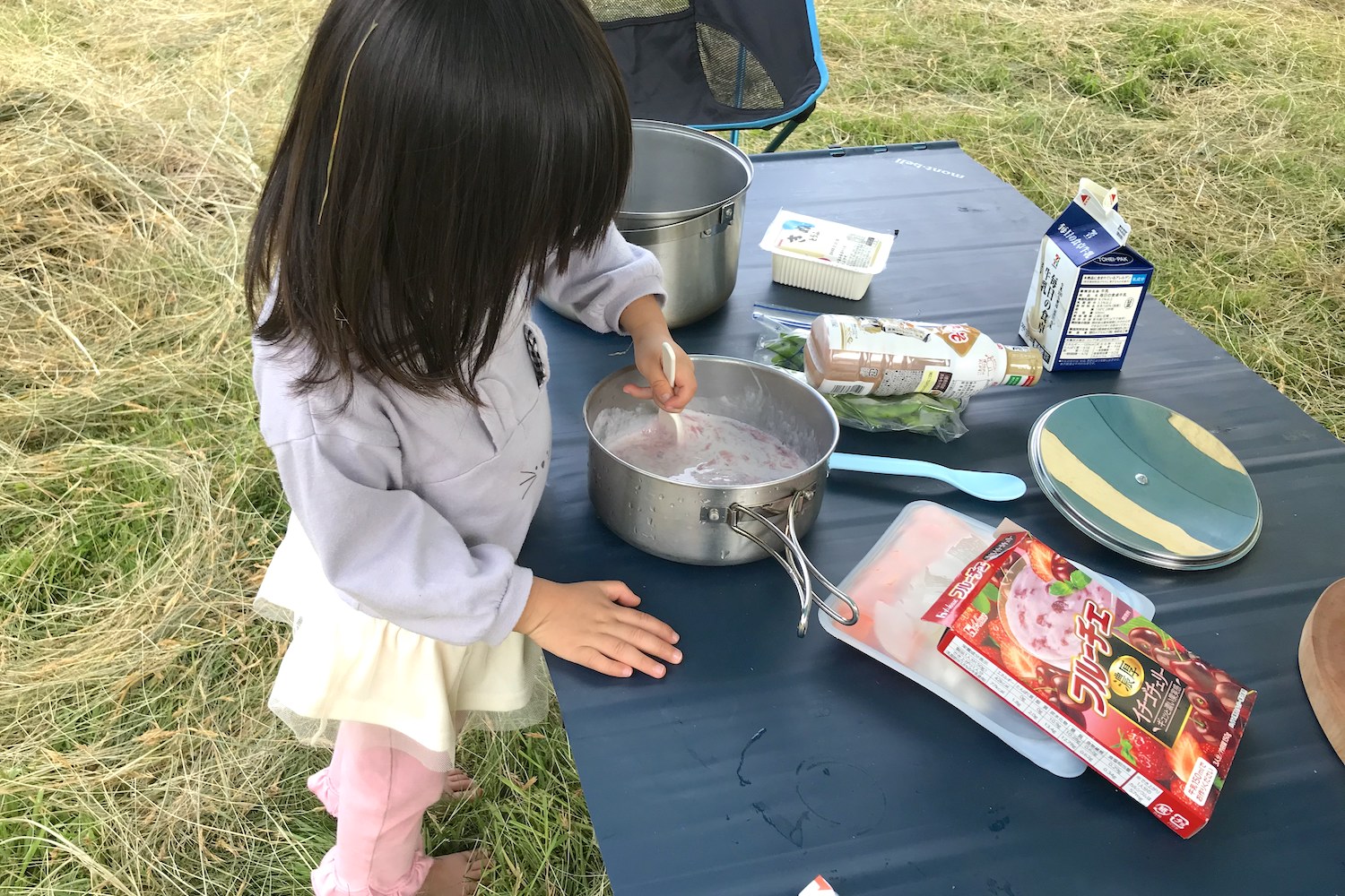 息子には、夫といっしょに焚火の番と、肉と野菜を焼く係を。娘には、小さな鍋に牛乳とフルーチェのもとを入れ、ぐるぐると混ぜるお手伝いをしてもらった。娘の様子を見ていると、つくりながら「味見」と言ってひと舐め、またひと舐め、何度も味見をしているではないか。半分くらいなくなりそうな勢いだったが、ほほえましく見守った。