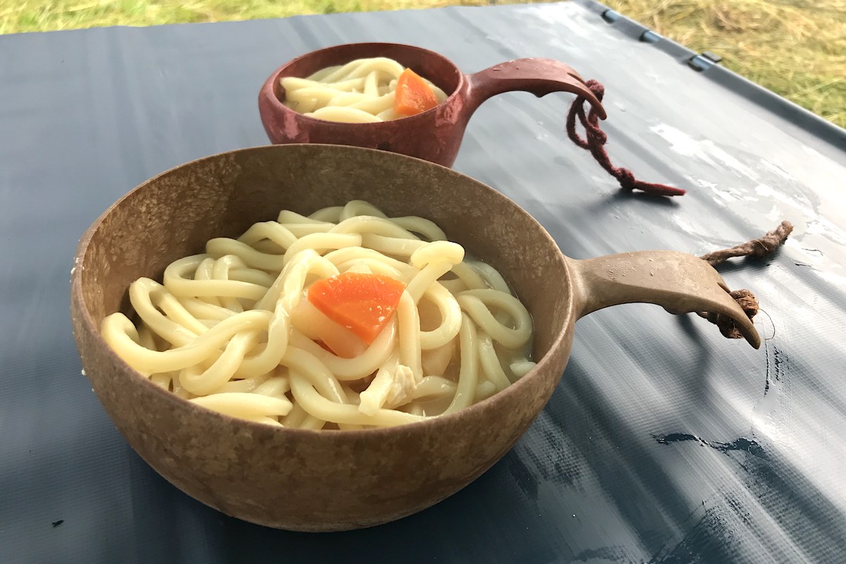 この2日目の朝食は、前日の残りの豚汁に味噌を追加したうどん。朝方は冷えることが多いので、温かいうどんは子どもたちもよろこんで食べてくれる。ほかには、すぐに食べられるチーズやフルーツ、野菜ジュースを添えて朝の食事は終了だ。