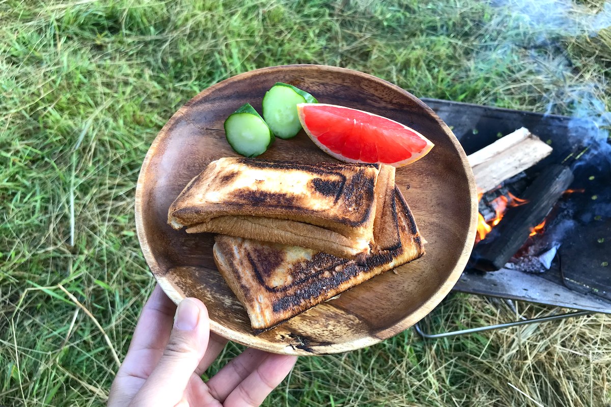 3日目の朝食は、子どもたちの大好きなのホットサンドをよくつくっている。パンは便利だ。お腹が空いたときにサッと出せば、そのままでおやつになるし、焼けばカリッと熱々でおいしく食べられる。具材は前日のカレーの残りにチーズをトッピング。ちょっとしたポイントだが、パンの側面にバターやマヨネーズを塗ってから焼くとこんがりとした、おいしそうな焼きめが付く。さらに、鍋にこびりついたカレーは少し牛乳を入れるだけでカレースープになり、最後までおいしくいただける。こうすることで残ったカレーもきれいになり格段に洗いやすくなる。片付けが楽になるよう意識しておくと、その後の作業もスムーズに進むのだ。