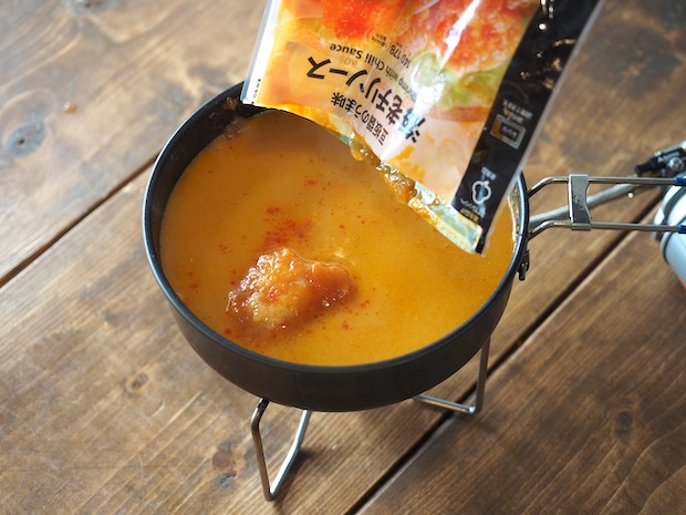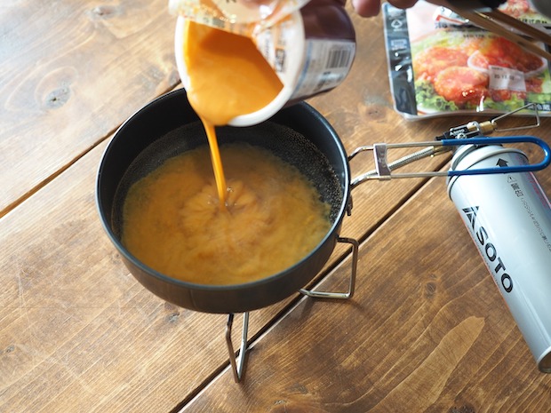 まずはビスクをコッヘルに注ぎます。ここに同じくらいの量の水を足しますが、ビスクの容器で水量を測れば内側を洗うこともできるのでGoodです。