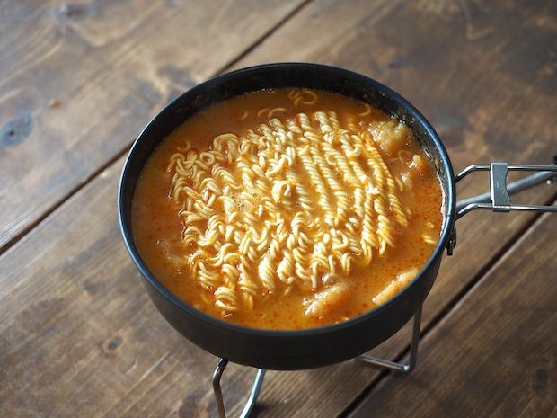 袋の内容物を全部注ぐように箸で袋を挟んでしごきましょう。そして火を付けて沸かします。噴きこぼれやすいので気を付けて! この撮影のときに噴きこぼしてテンヤワンヤでした。山だったら結構めんどくさいですよ。