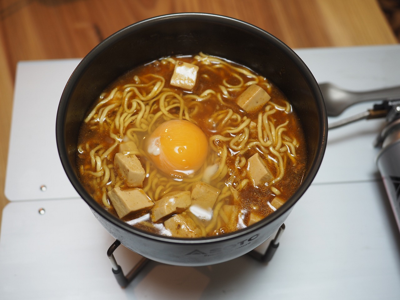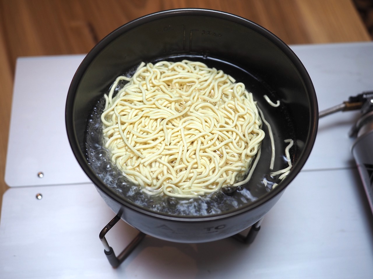 では早速作っていきます。普通にラーメン作るにはちょっと少なめの350㏄くらいの水(だいたいでOK)をコッヘルに入れて沸かしたら麺を入れます。