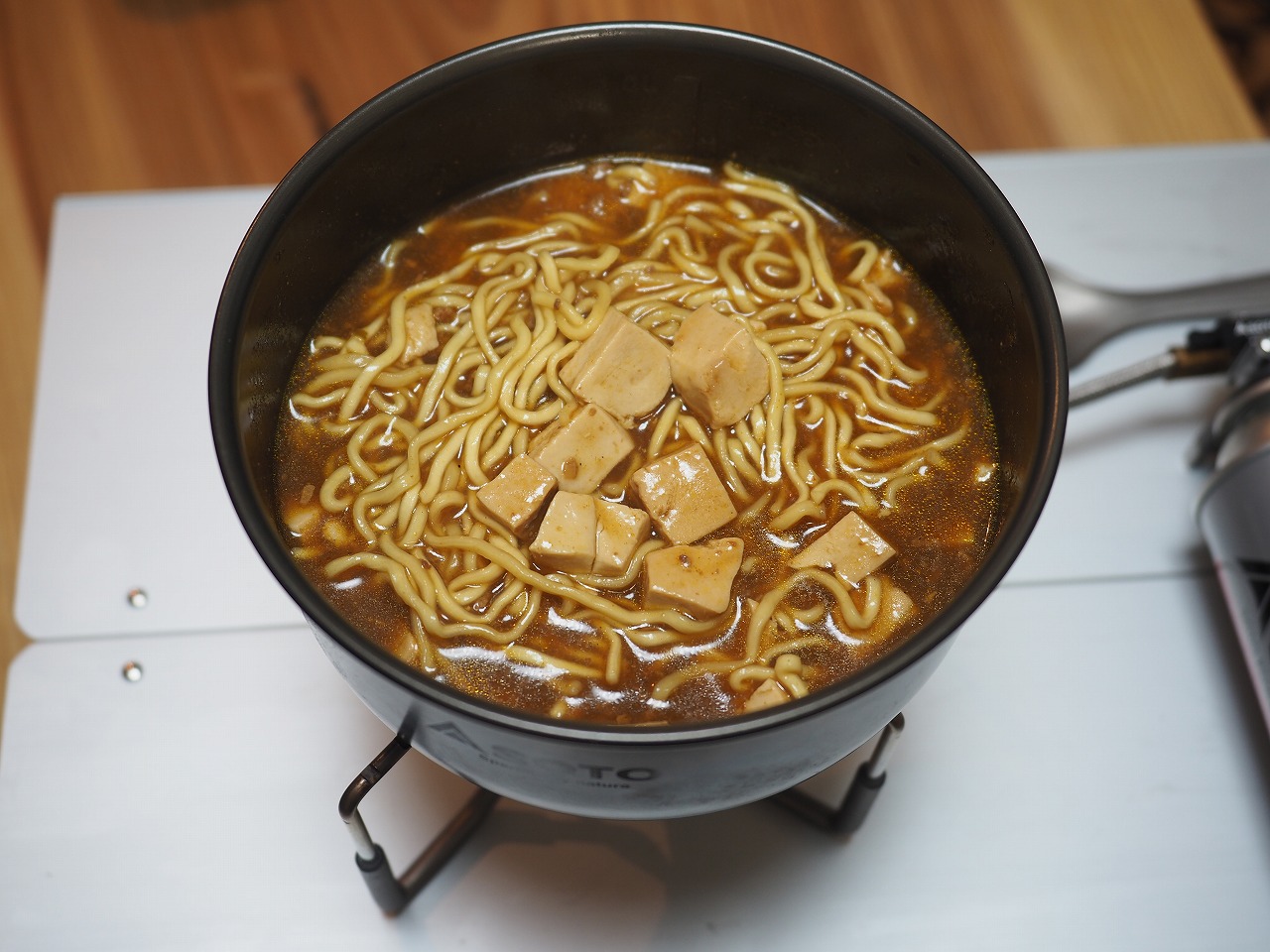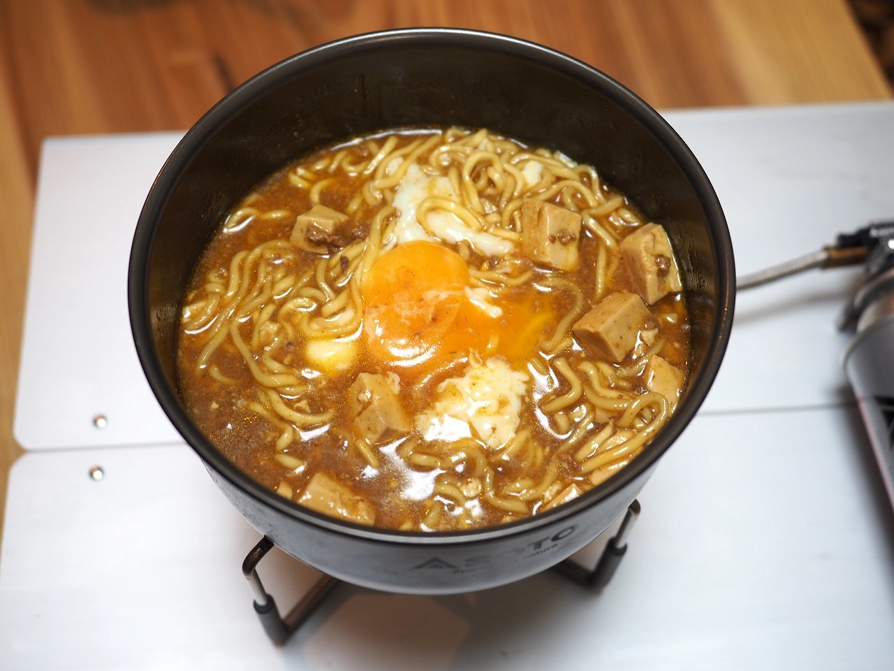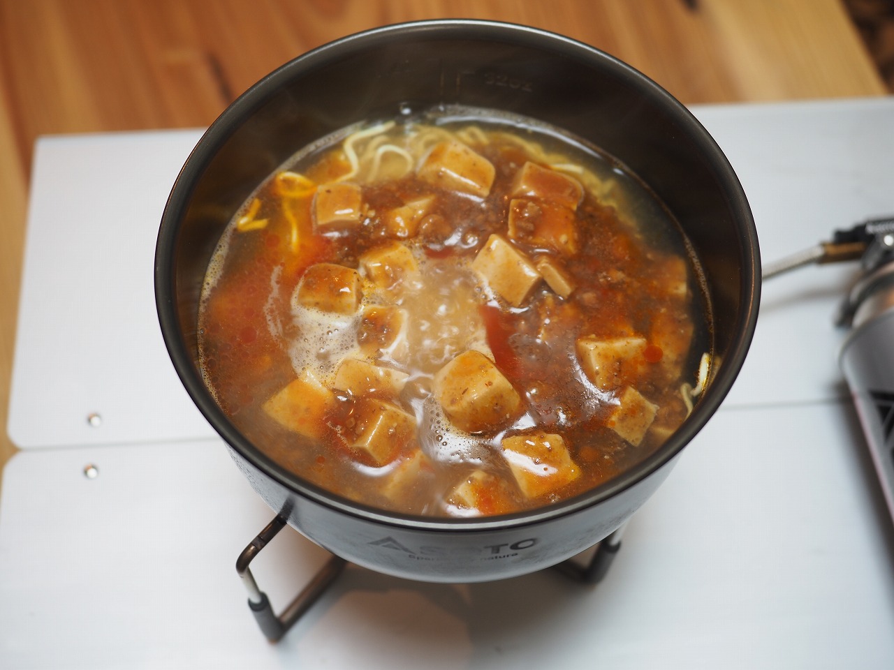 出オチですみませんが美味しいです。「ものぐさ男の山ごはん63」は麻婆豆腐パウチとあの粉混ぜた旨辛ラーメン