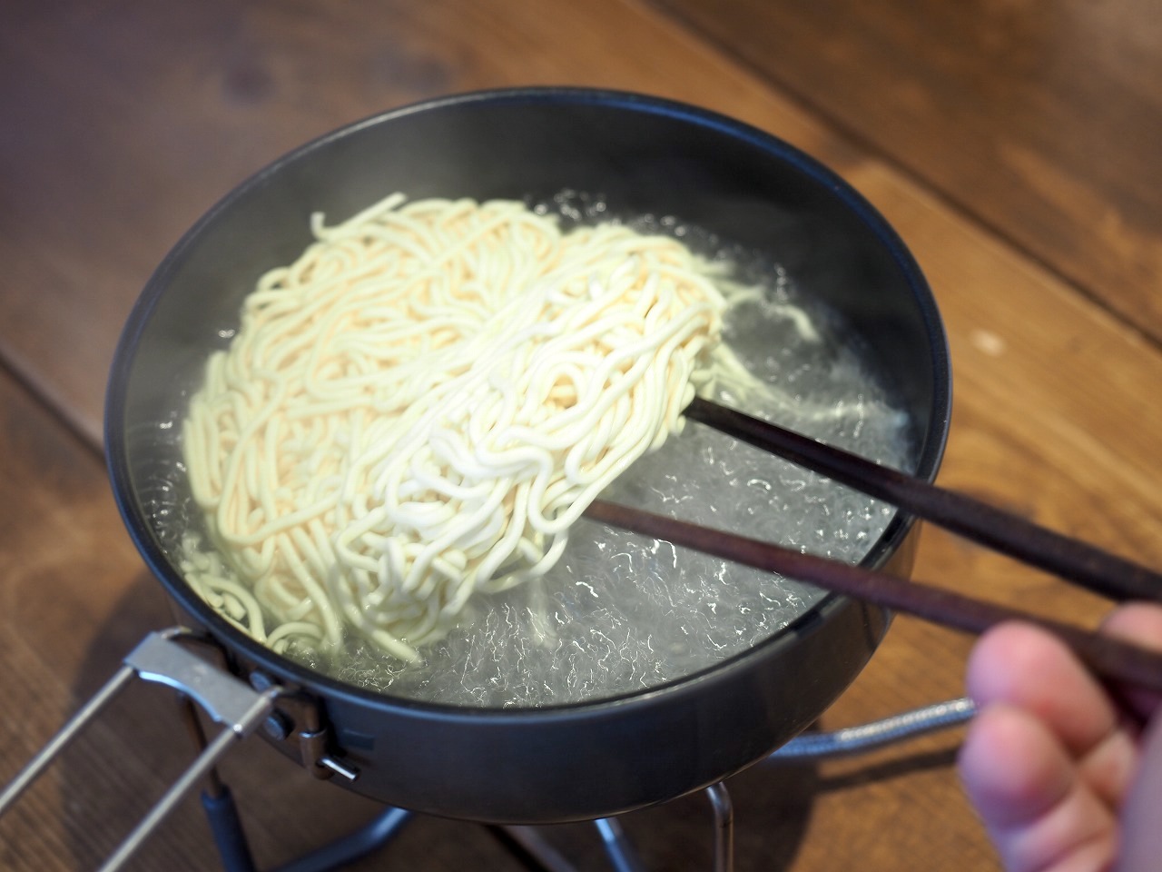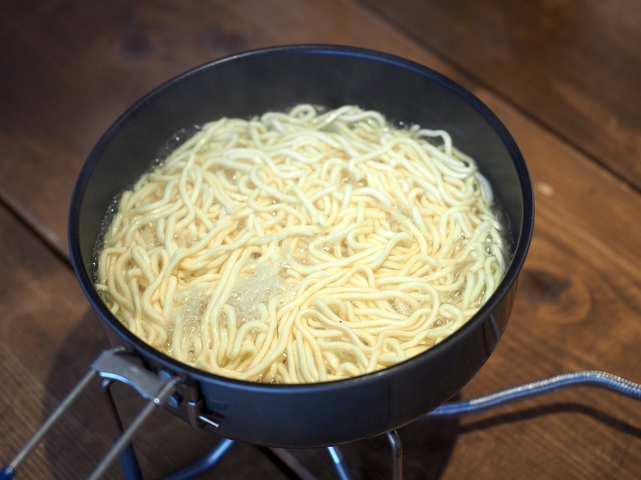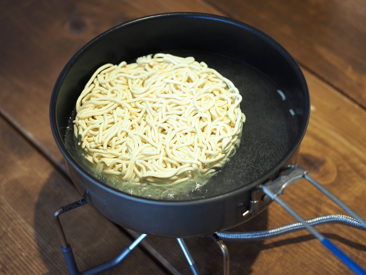 鍋のサイズは乾麺が入るギリギリの方がイイですよ。なぜって水の高さが上がり、麺の浸かるエリアが多いから。沸騰させたら麺を入れます。