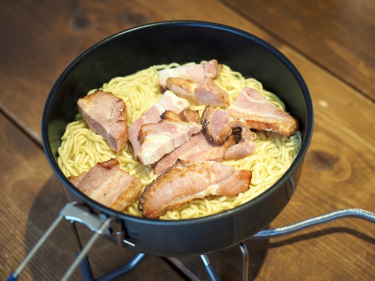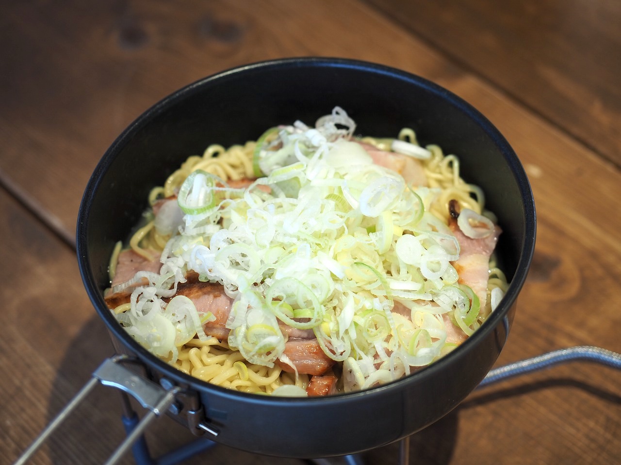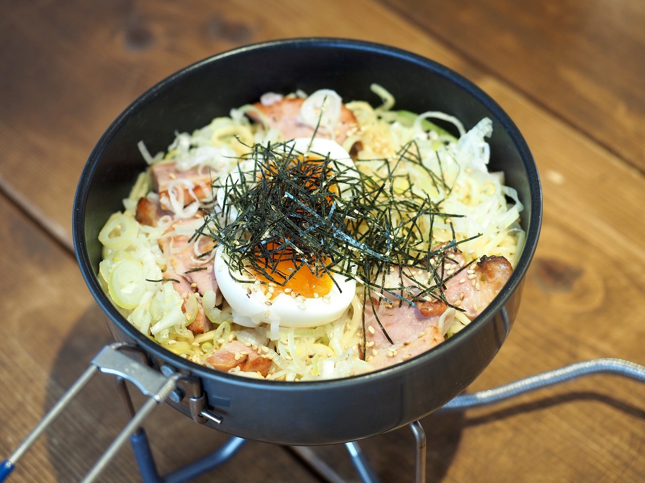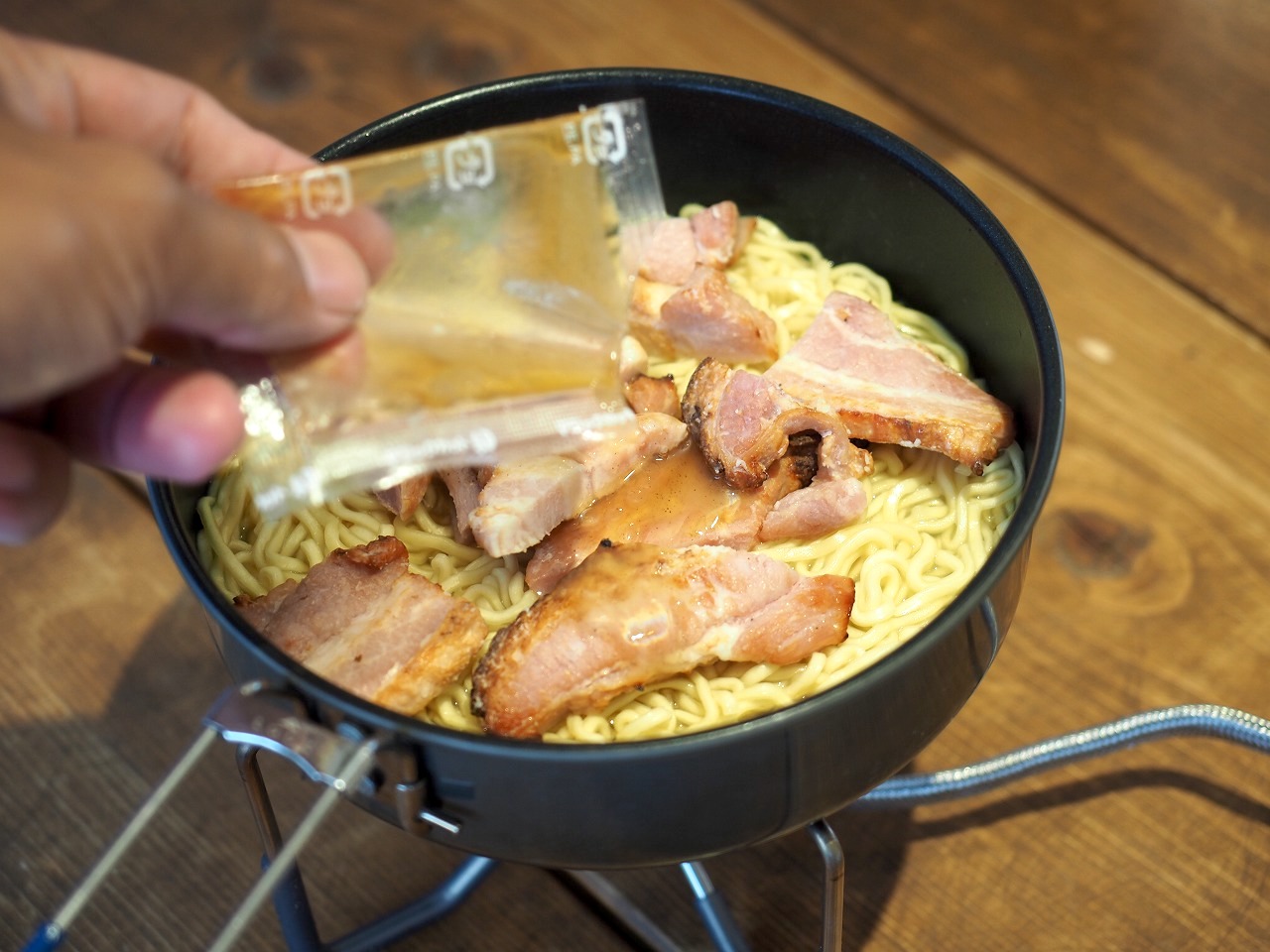 このレシピをマルちゃん正麺で作って帰りのバックパックで残りの醤油タレが漏れた!……などという苦情は受け付けません(笑)。山ではパウダーのタレで作ってください。