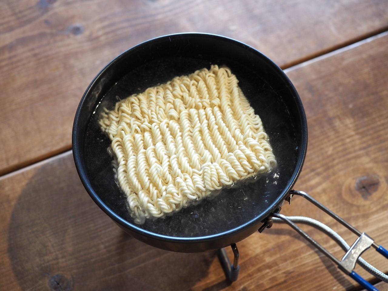 まずは鍋(フライパンですが)に水を入れて沸かします。で、麺を入れて煮込む。まぁ、普通です。水の量も普通でOK。