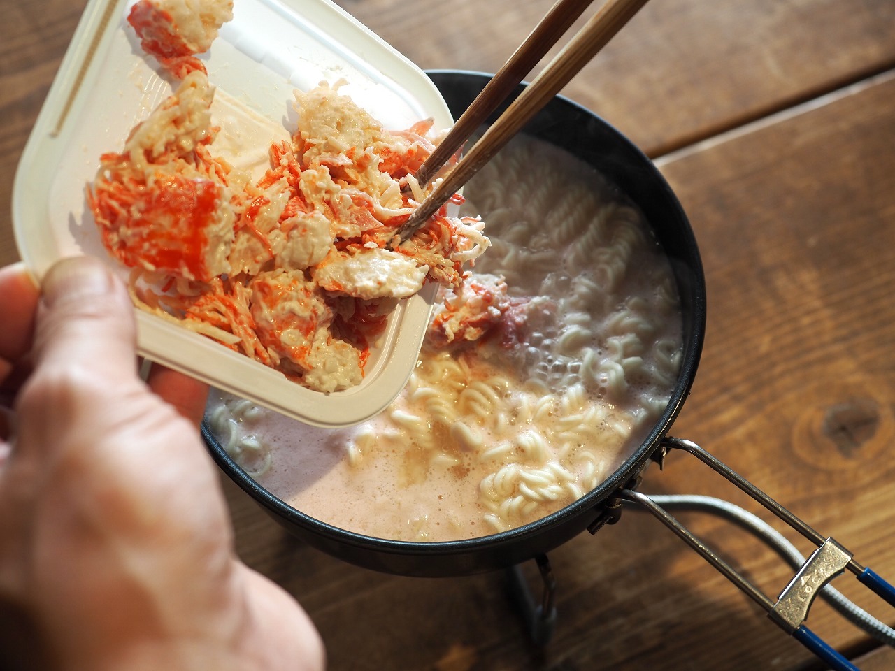 で、次は「おつまみカニカマ」。一気に入れてしまいましょう。で、かき混ぜます。