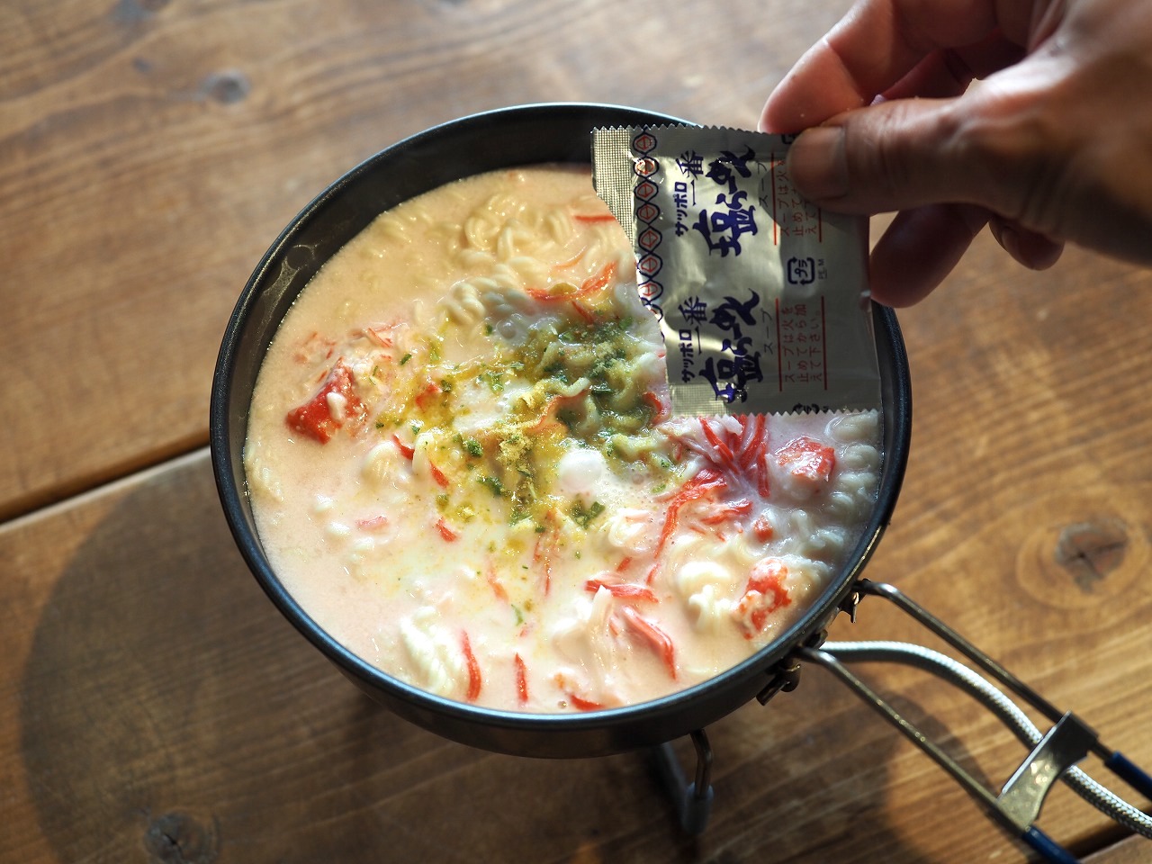 きっといいことがある薬味登場! 「ものぐさ男の山ごはん70」はどこか豚骨っぽい簡単シーフードラーメン