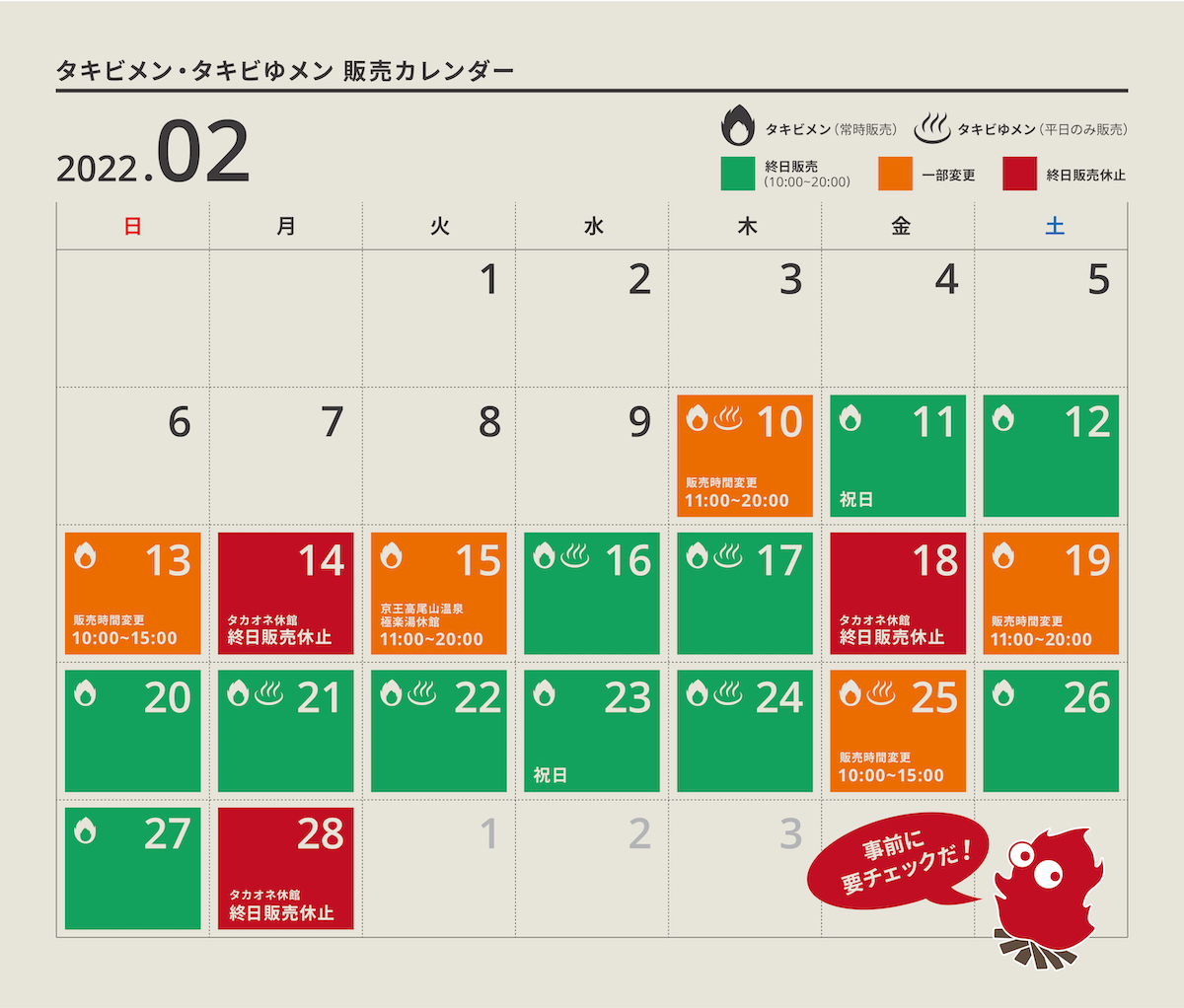 2月中の販売スケジュール。販売時間の変更、タカオネや極楽湯の休館日もあるので、事前にチェックしてから向かおう。