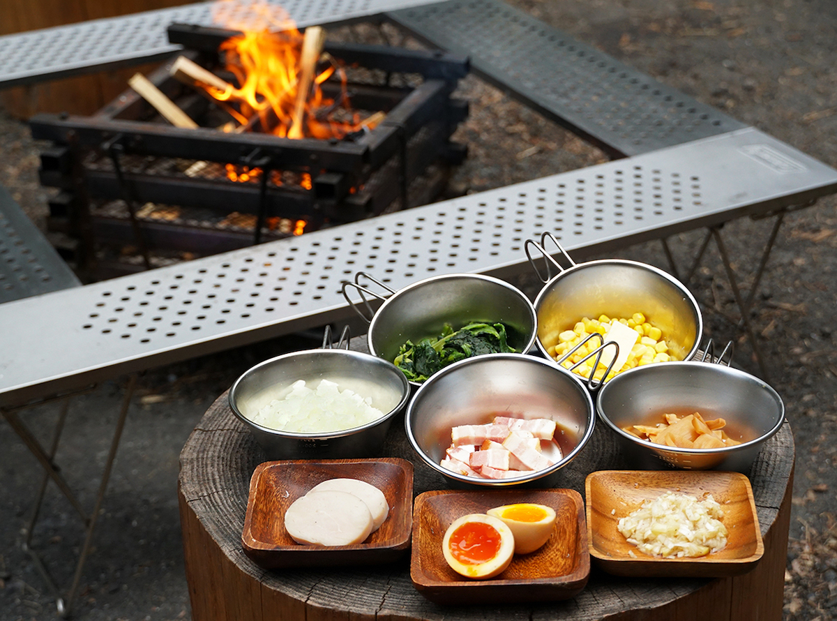 トッピングをウェルカムカウンターで買って好きな具材を入れられる。焚き火で自作したタキビメンは絶品のはず! 画像を見ただけでよだれが止まらない……。