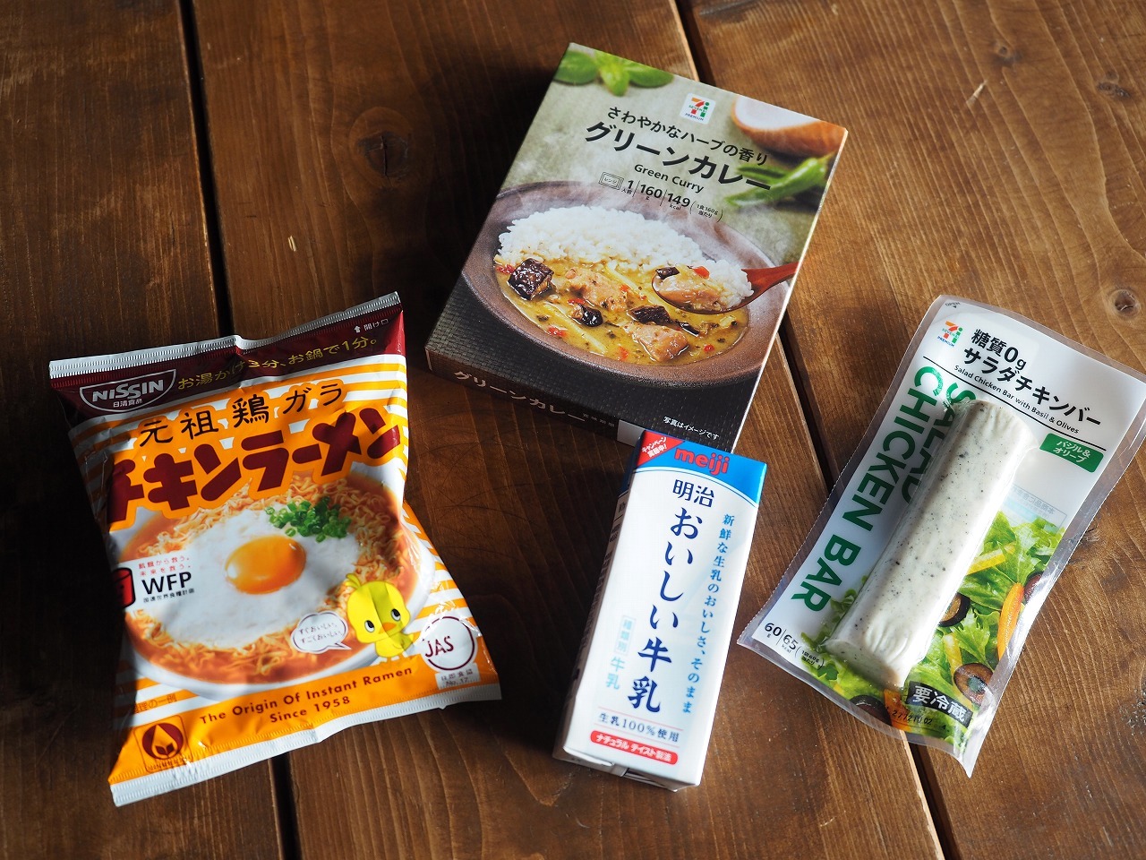 まずはレトルトの「グリーンカレー」。それとサラダチキンバーのバジル&オリーブと牛乳。