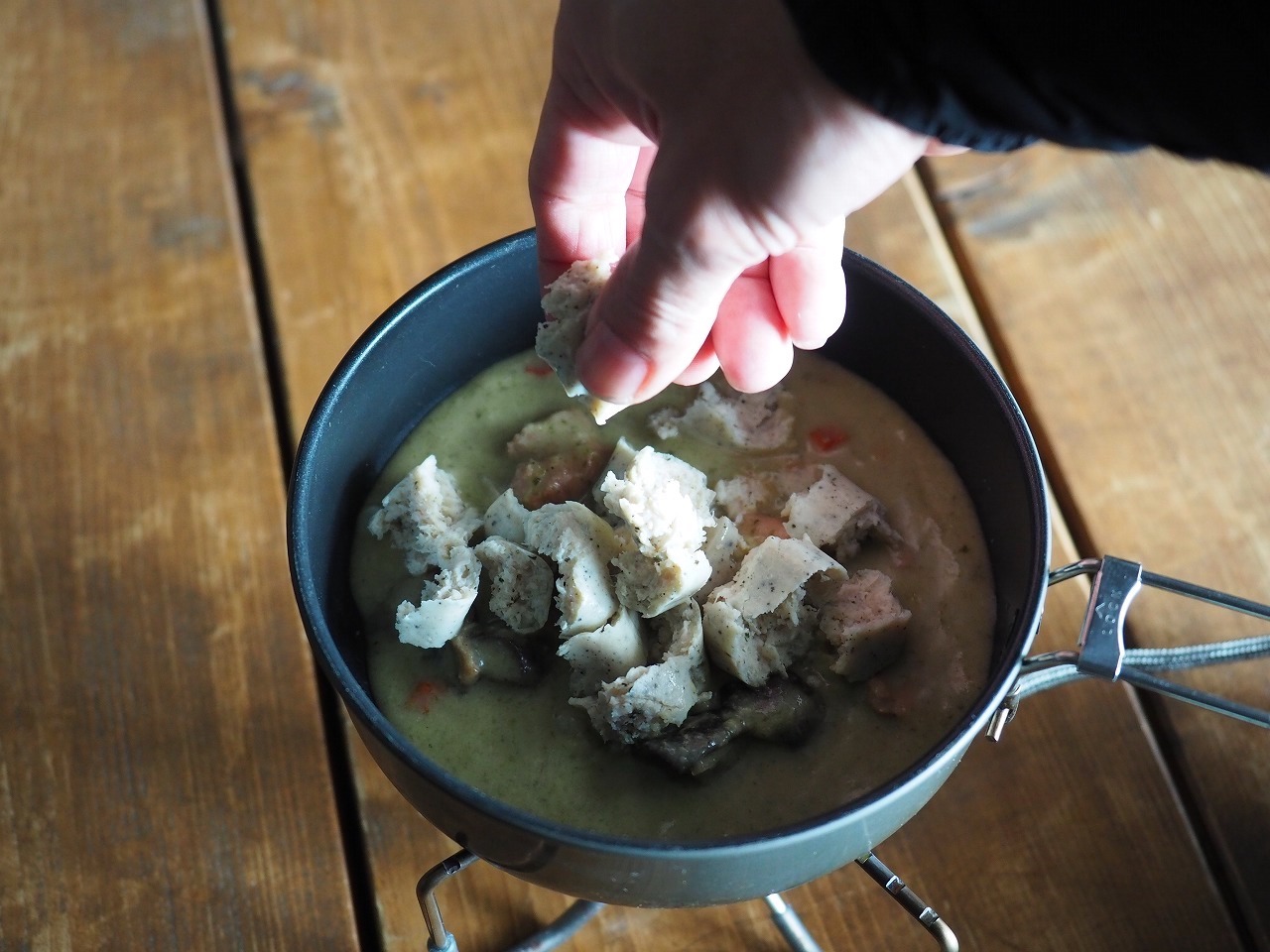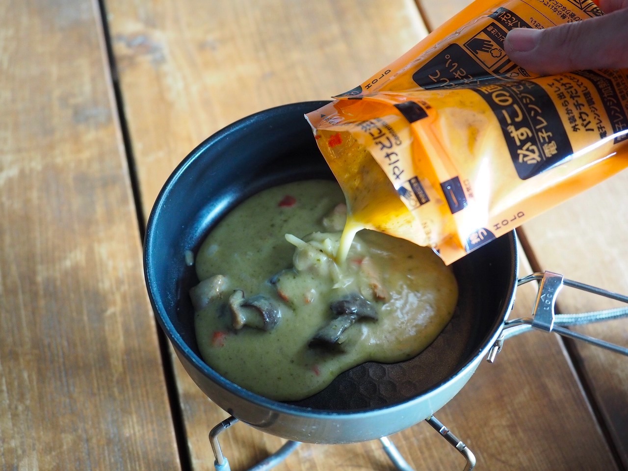 まずはグリーンカレーをコッヘルに開けます。なかなか具だくさんです。