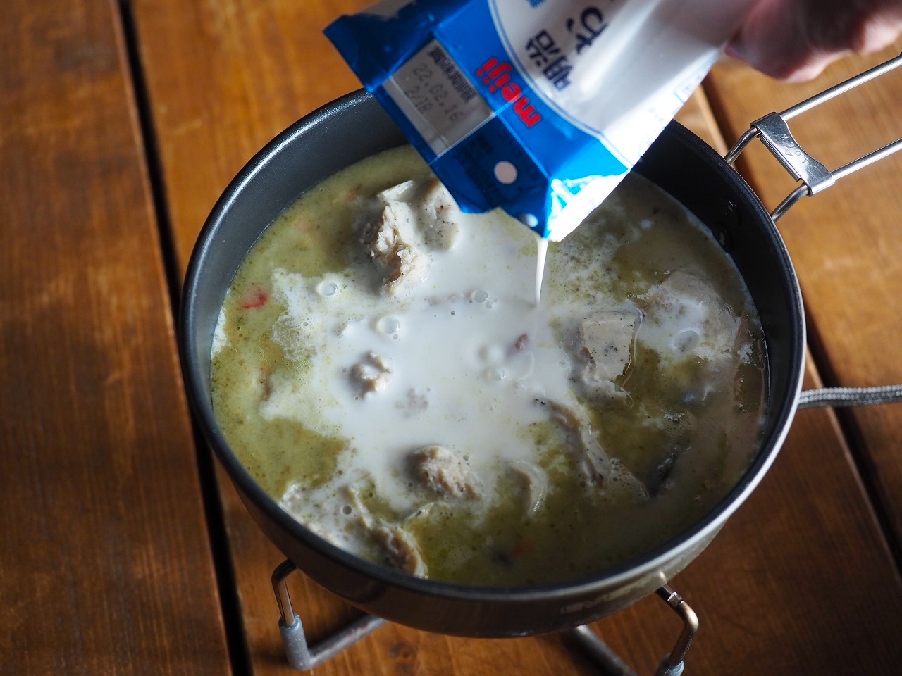 今回はさらに具沢山にするためサラダチキンバーをちぎりながら入れていきます。これも「そんなお肉いらないッス」な人はなくてもOK。でもバジルの風味とグリーンカレーのコンビはなかなかの美味なのだ。