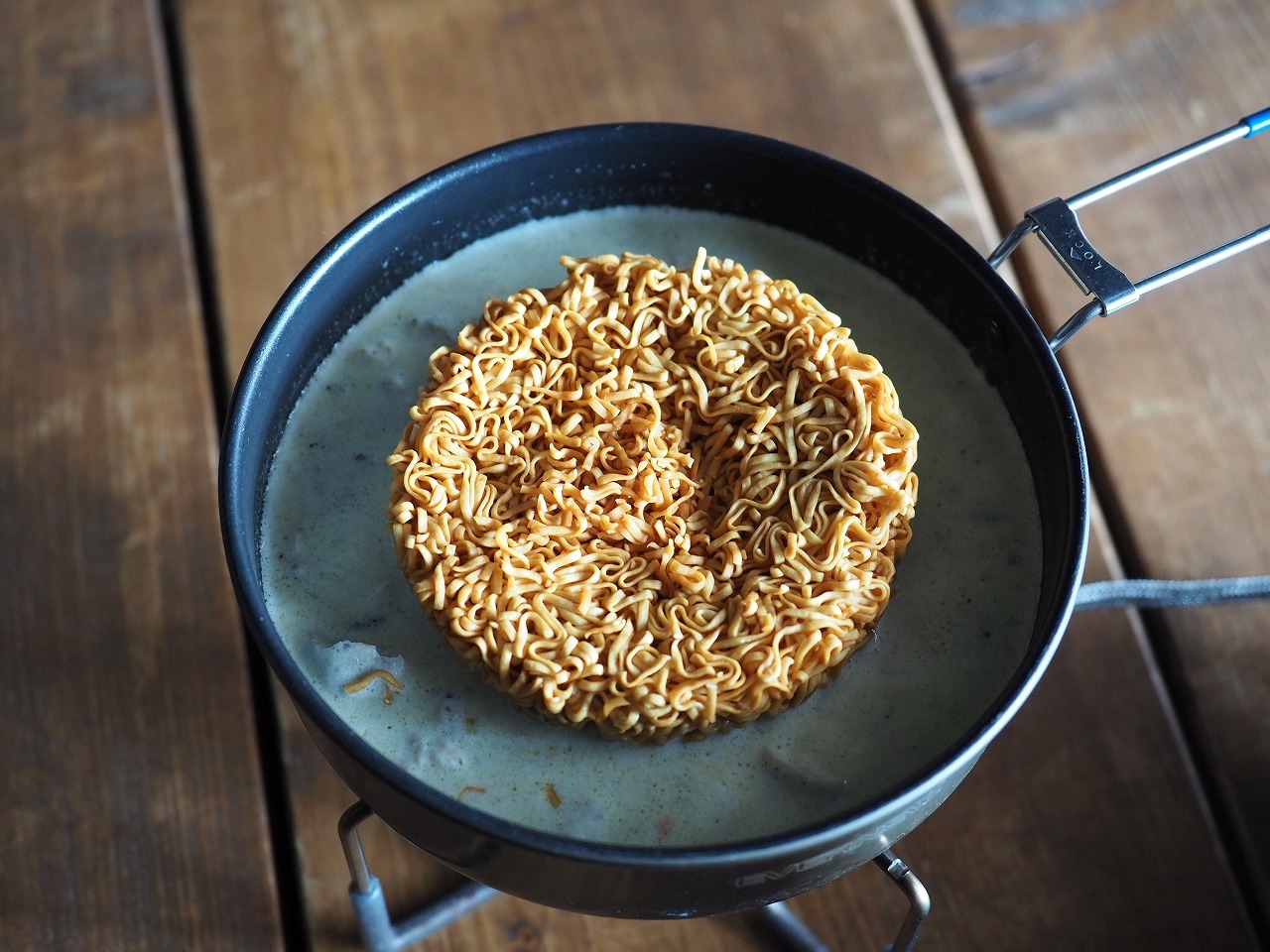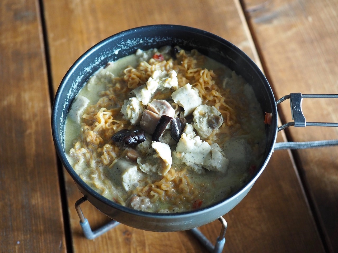 寒い山で温かいタイ風ラーメンが染みる! 「ものぐさ男の山ごはん72」は、マイルドなグリーンカレーラーメン
