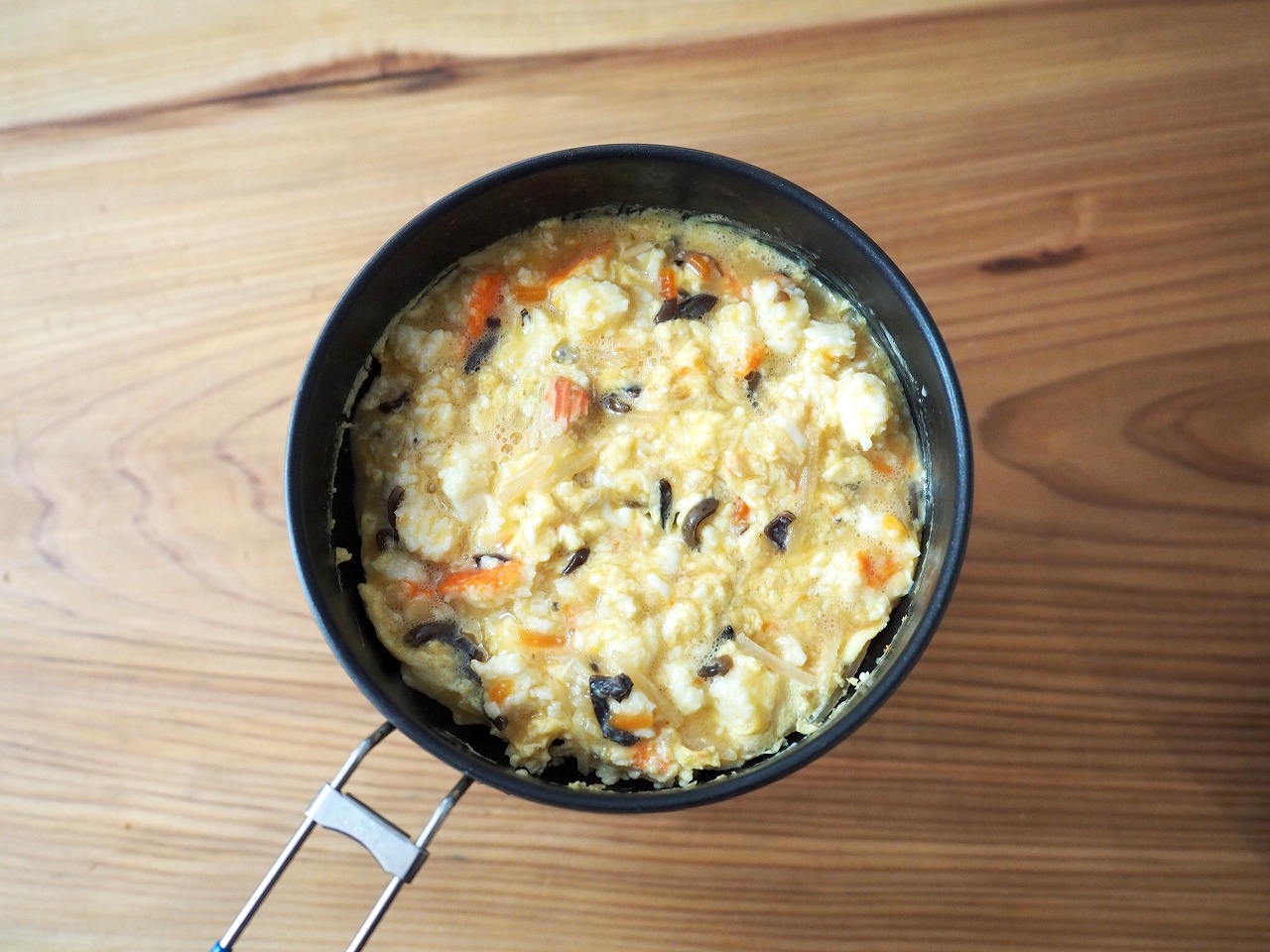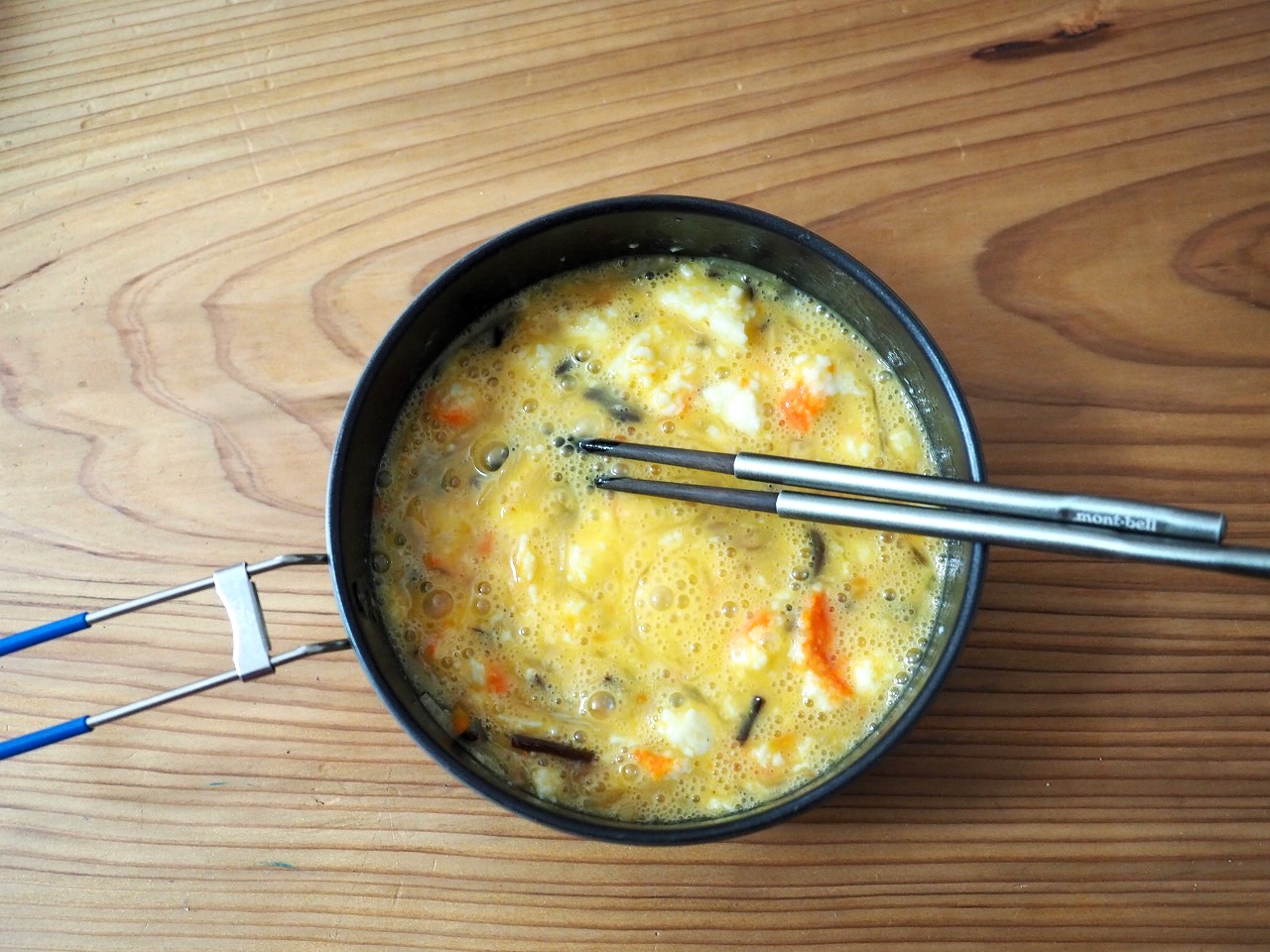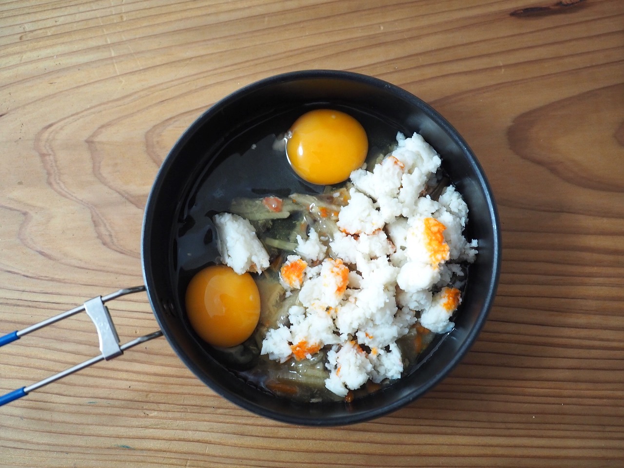 タマゴが2コだからボリュームもあるし、実はかなり具沢山なので満足度が高い。コッヘルをふたつ使うだけの価値があると思うよ!