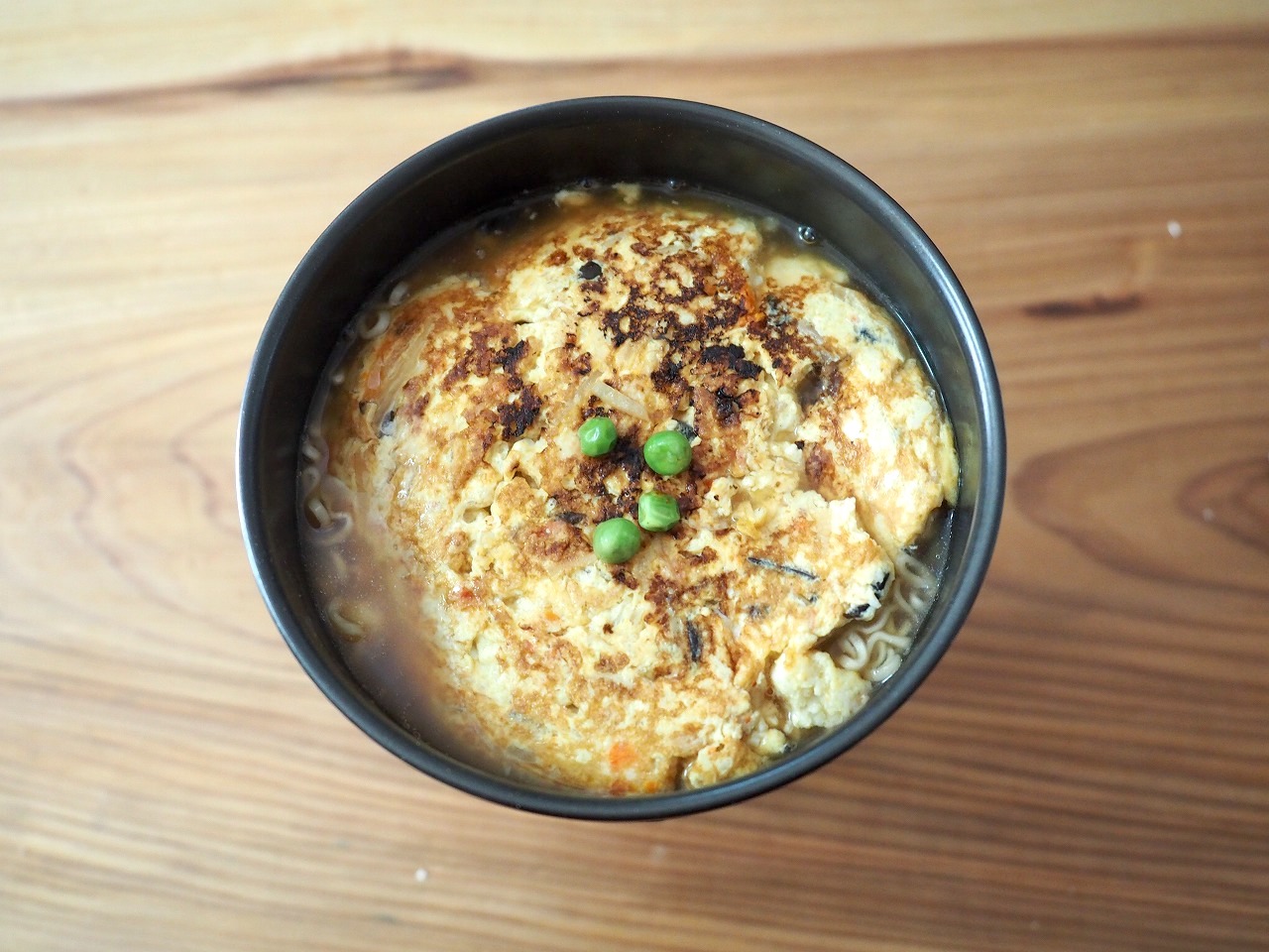 スープはそれだけだと少し薄味だけど、とろみがついて優しい味。上に載ったかに玉はタマゴ3個のレシピのところ2個で作ってるのでちょっと味が濃いのだ。だから麺と一緒食べるとバランスよくてとても美味しい。