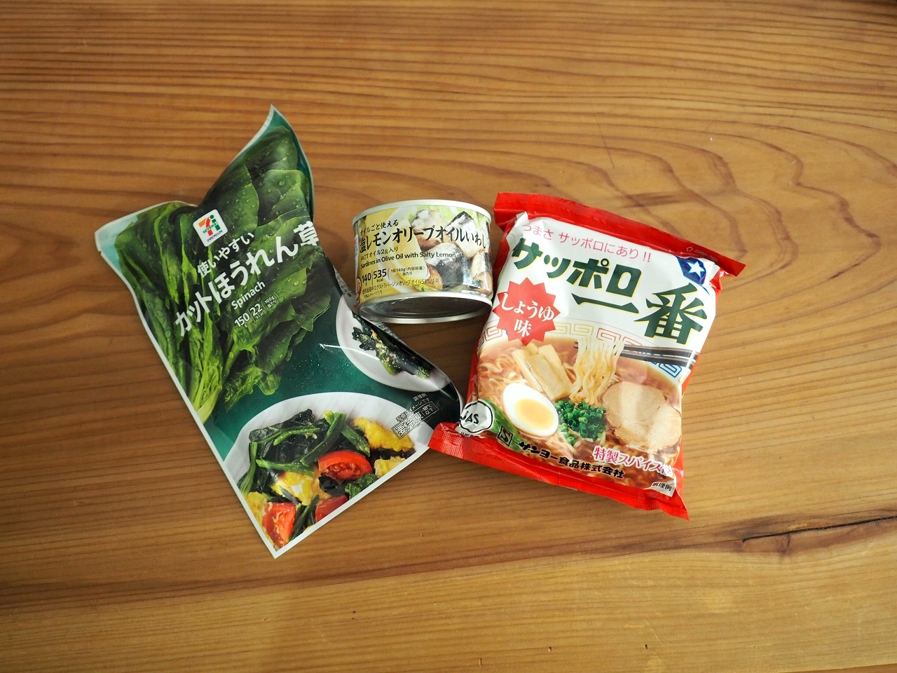 今回のラーメンはサッポロ一番のしょうゆラーメン。スープも使います。それとセブンイレブンの缶詰「塩レモンオリーブオイルいわし」。それと冷凍の「カットほうれん草」。