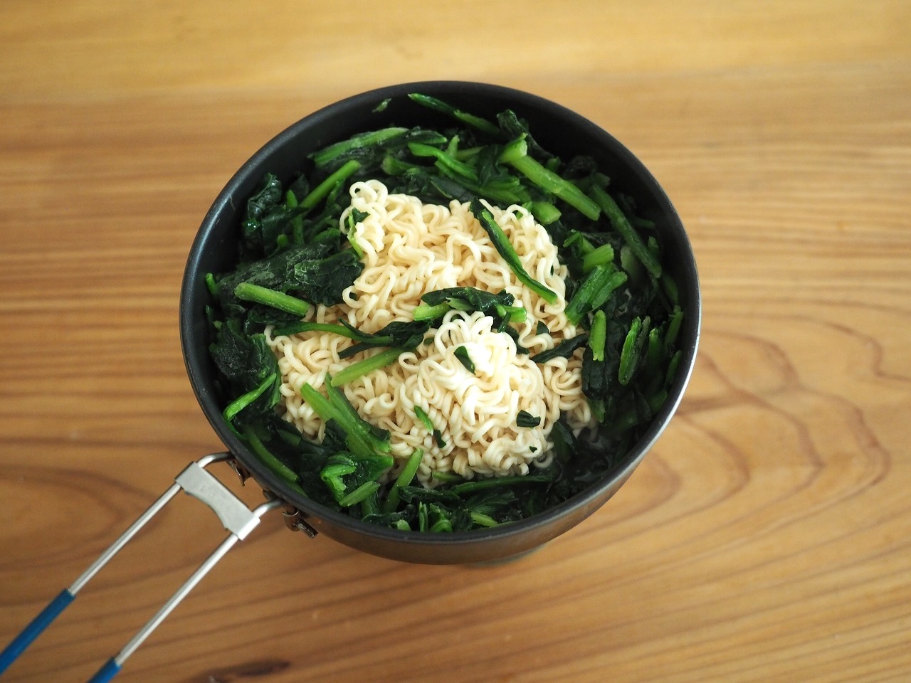 麺が半分しか漬からないので途中でひっくり返しましょう。ひっくり返したくらいでカットほうれん草を全部入れます。多いですが全部入れます。ふたりで作る場合は半分ずつでもイイかもですが、意外にペロッと食べられてしまいます。