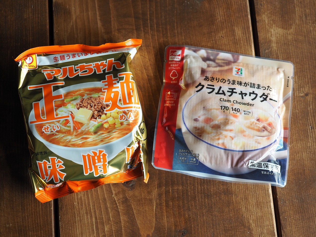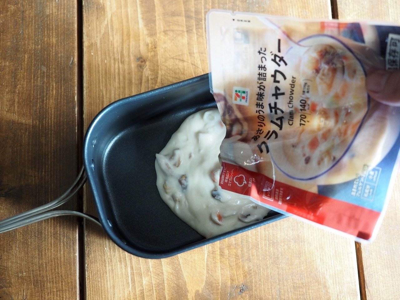 それとセブンの「あさりのうま味が詰まった クラムチャウダー」。コレ常温保存可!