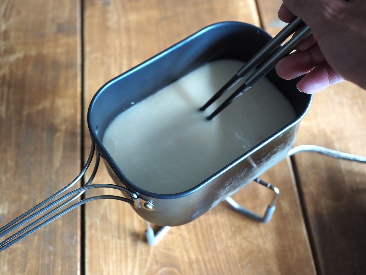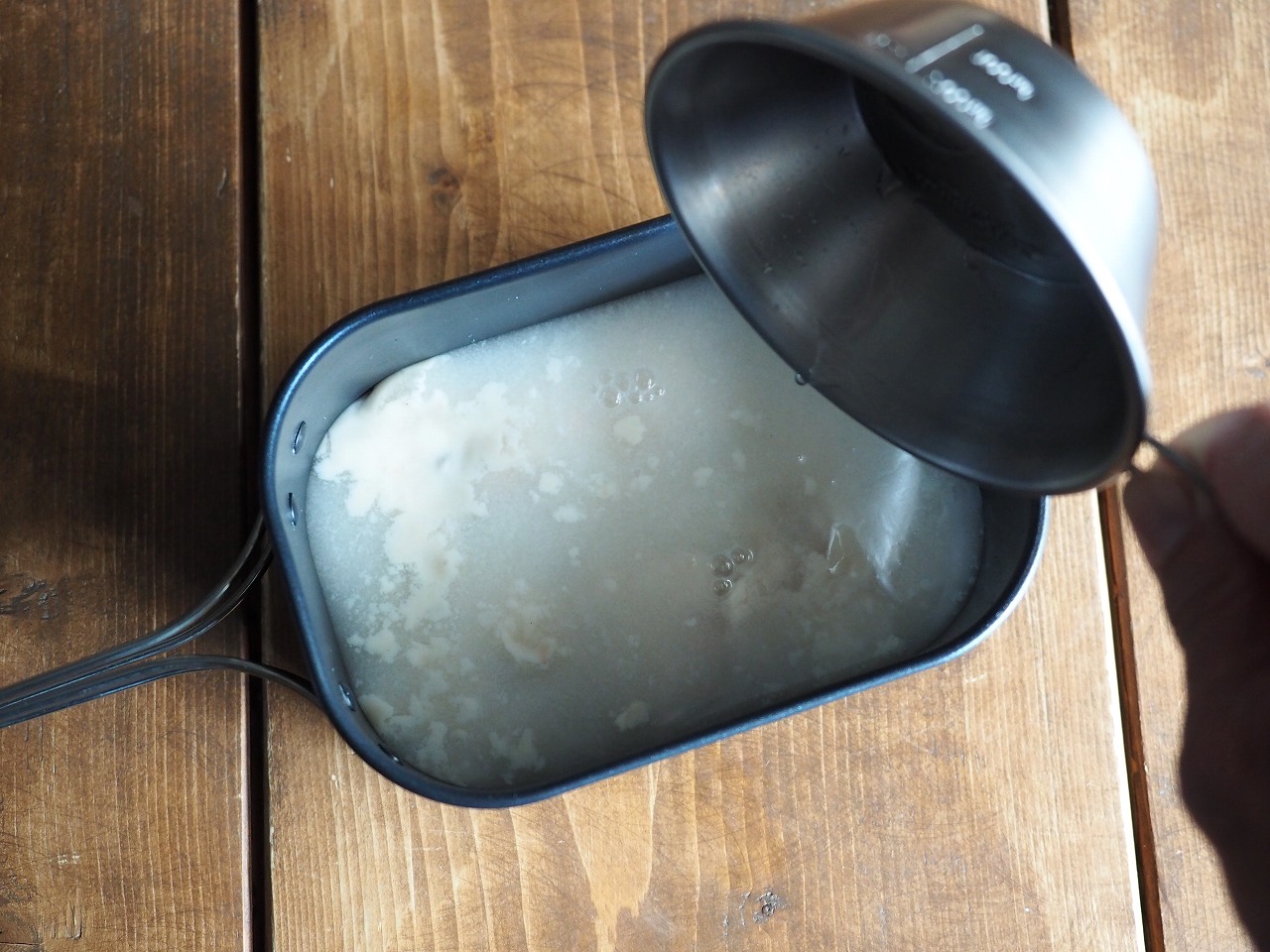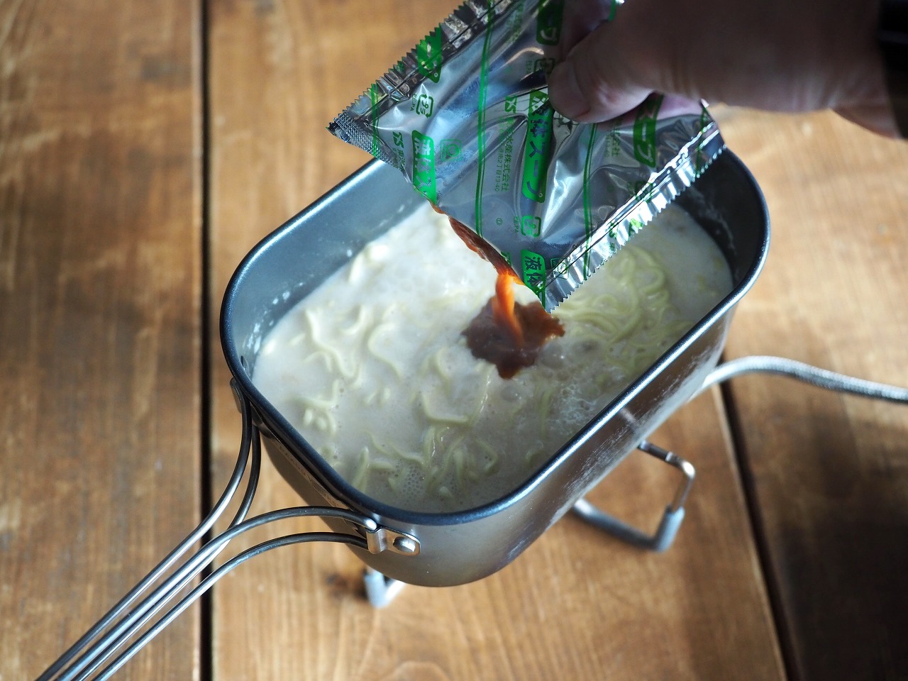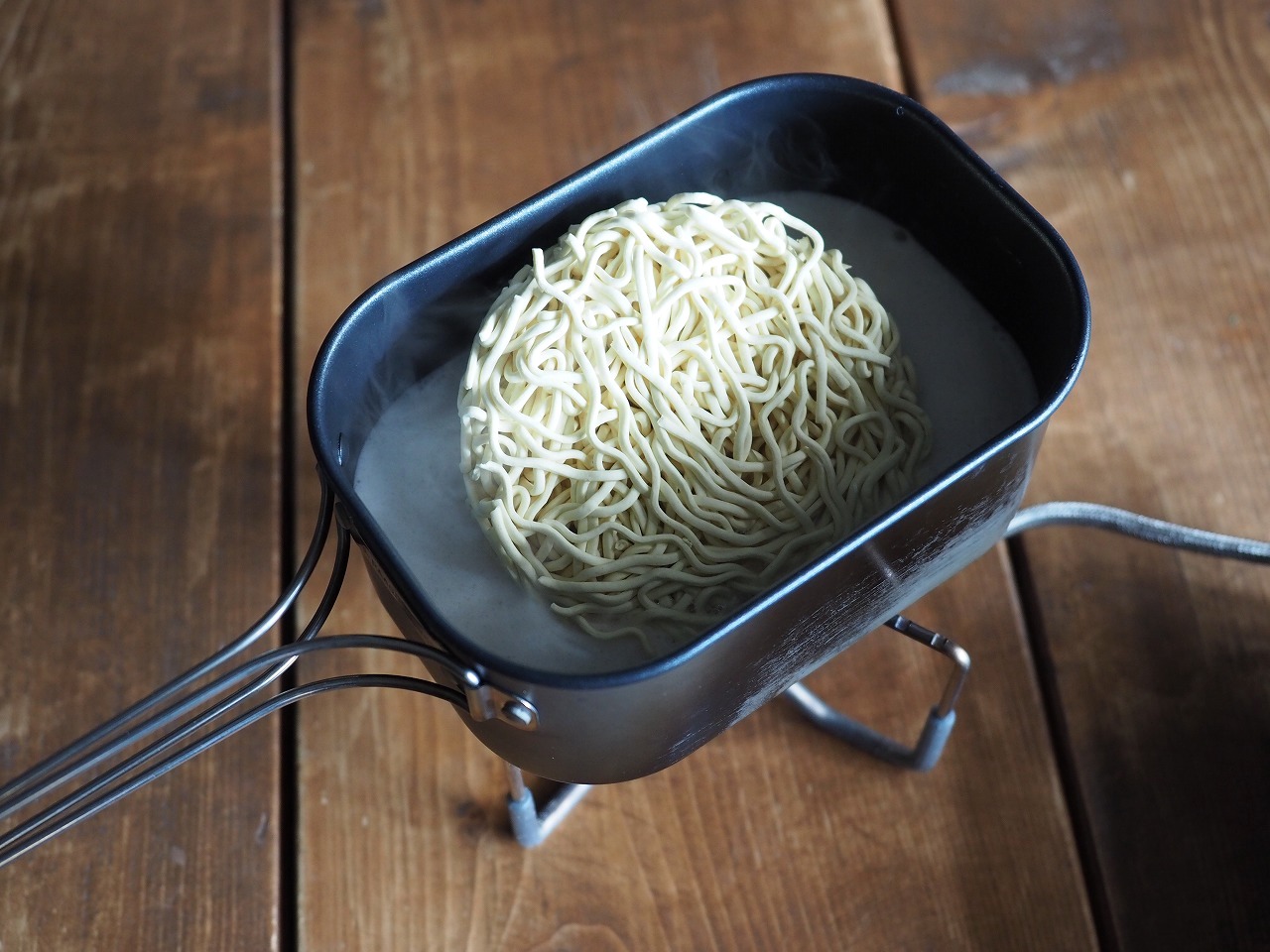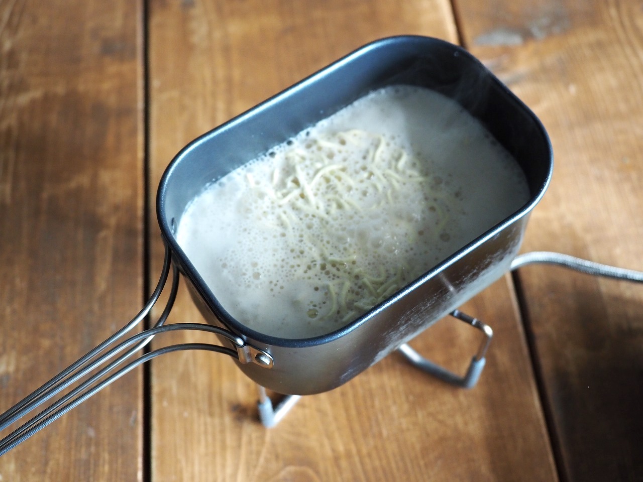 強火だと焦げ付く可能性があるので時折かき混ぜながら弱火~中火でゆっくり沸かします。PAAGOのTRAILPOTは袋麺がバッチリ入るサイズ感なのが売り。まぁ、角型コッヘルはみんなそれがいいところだよね。