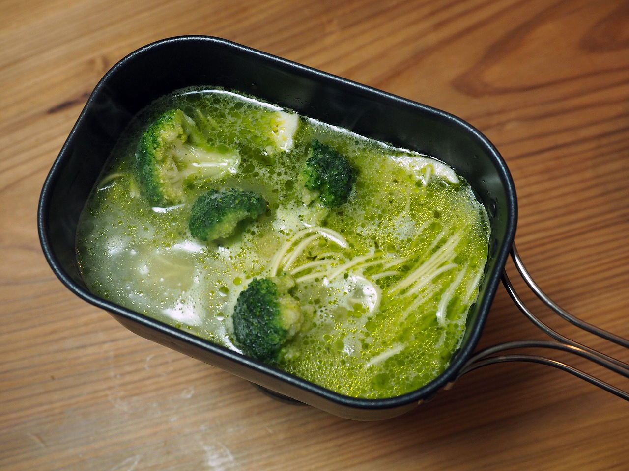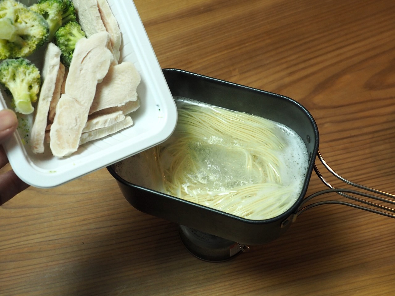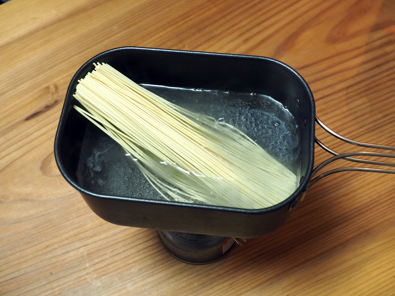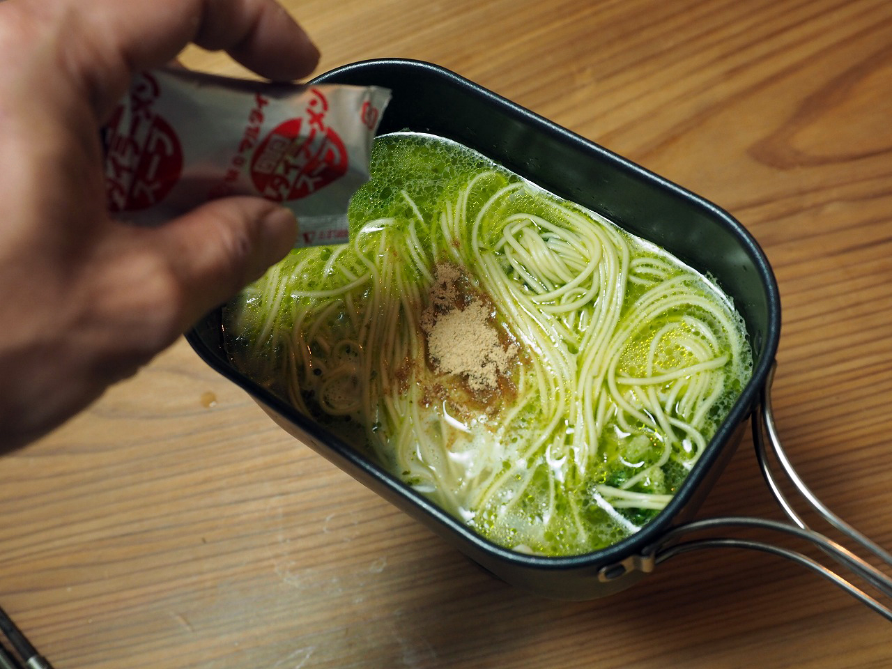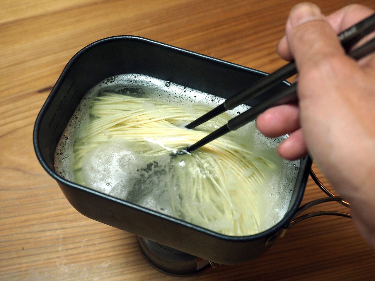 で、沸いたら棒ラーメンを茹でます。Trail Potなら対角線でほぼ収まる。数秒すれば箸で全部押し込めます。