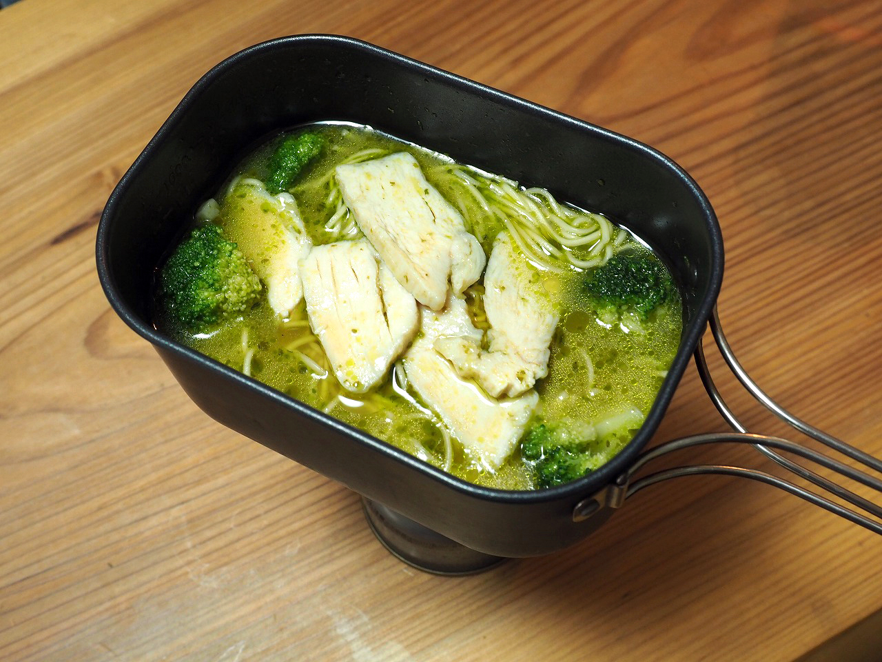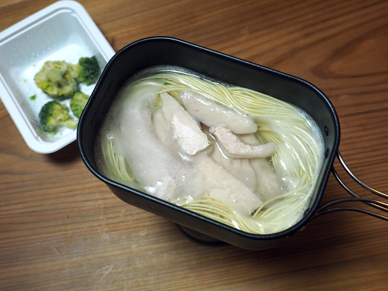 鶏むね肉とブロッコリーは冷凍食品ですがデフォルトでは味がついていません。さすがにしみ込むほどではないですがバジルソースで煮ることでイイ感じになります。ボリュームも多いのでマルタイとバジルソースも全部使って2人前作るのもイイですね。