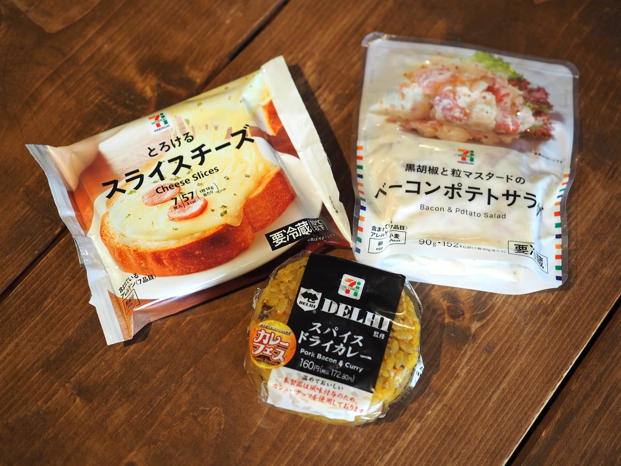 それとパックの「黒胡椒と粒マスタードのベーコンポテトサラダ」。そして「とろけるスライスチーズ」の3つ。たったコレだけです。