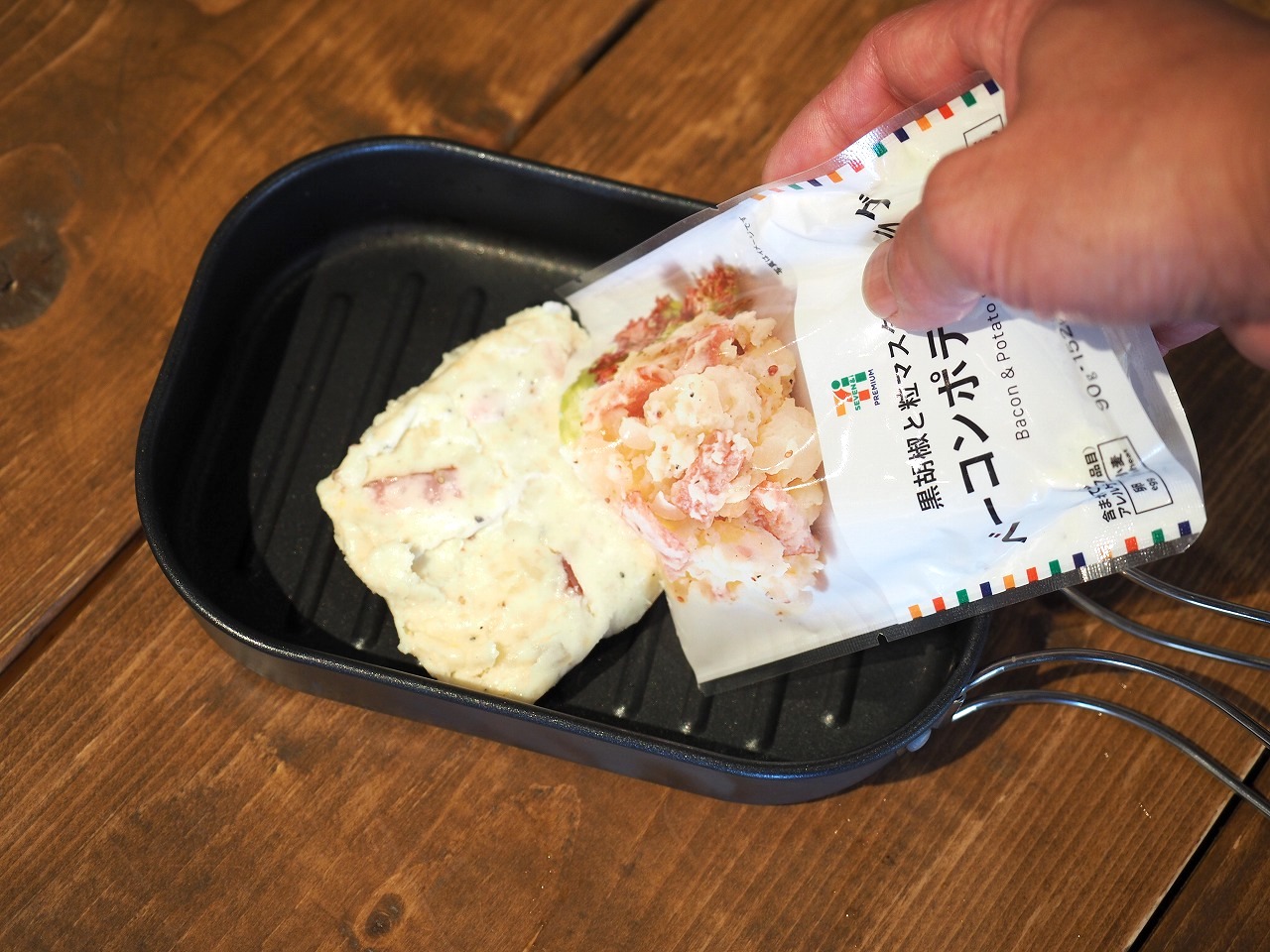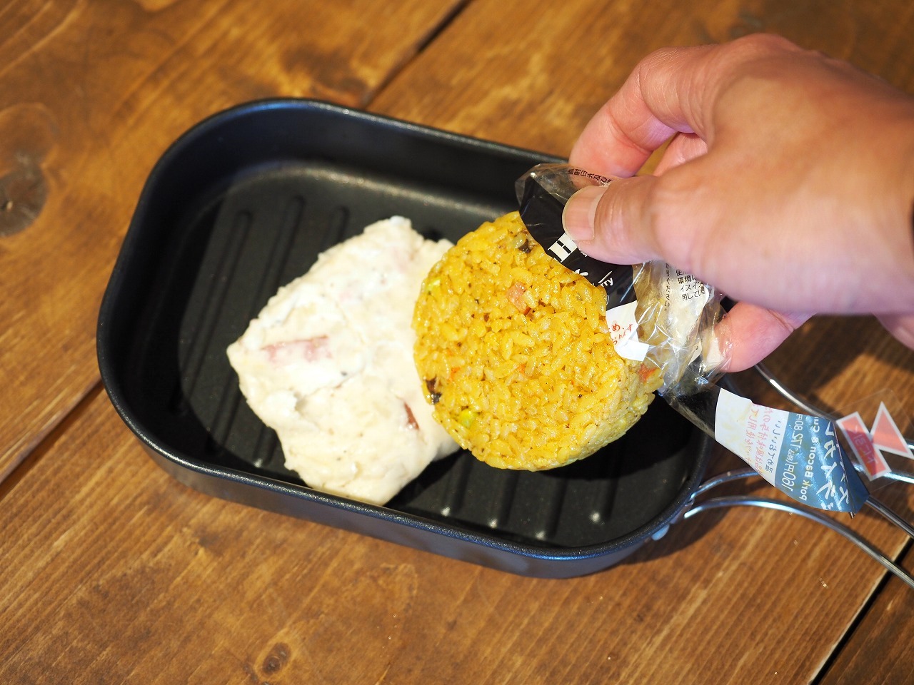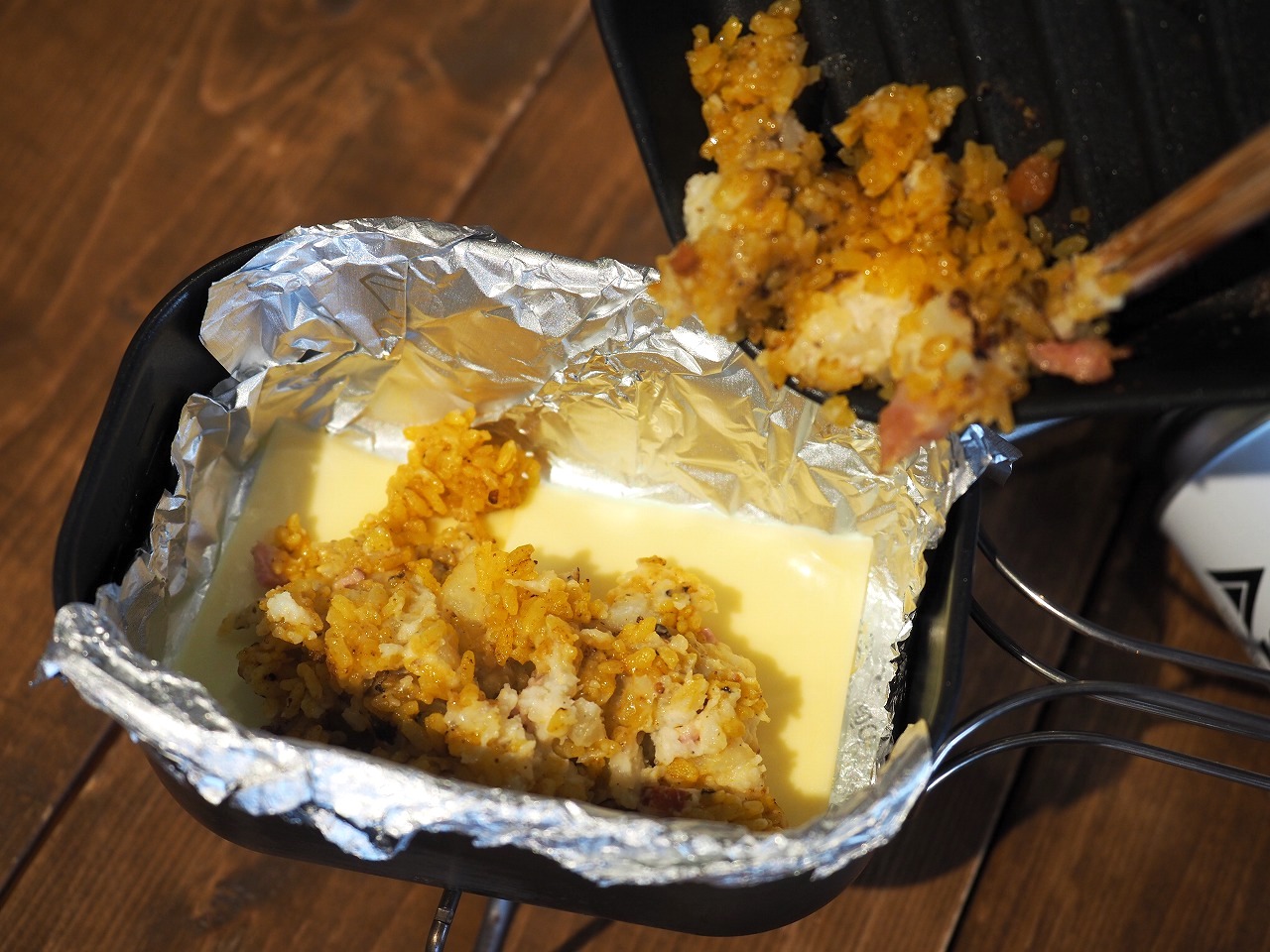 温まっていたらおにぎりとポテサラを合わせたものをコッヘルのチーズの上に平たく盛ってまたフタをして弱火で火にかけます。