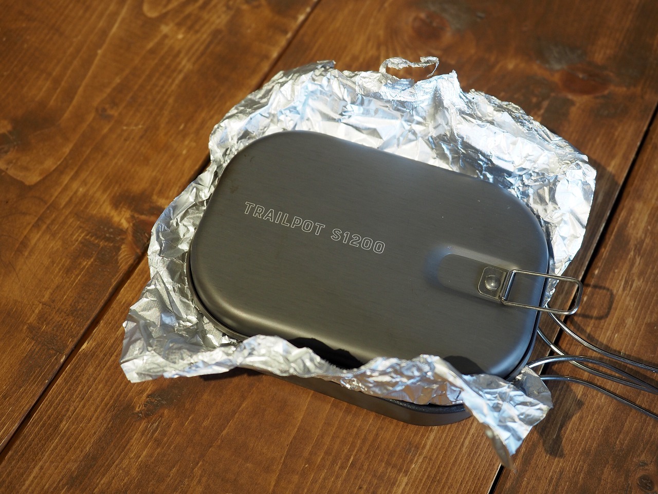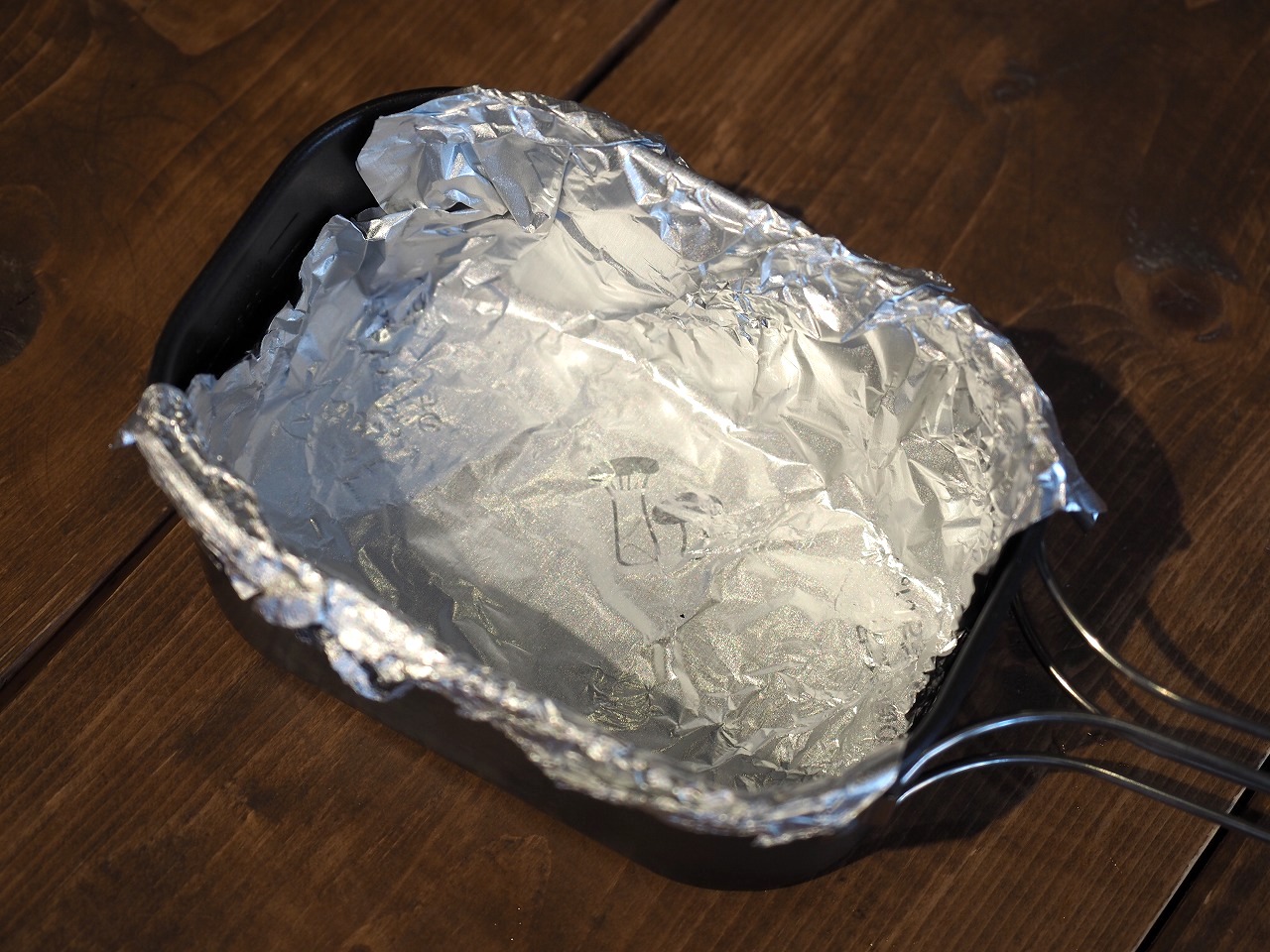 コッヘルにはシリコン加工されてくっつかないアルミホイルを敷いておきます。