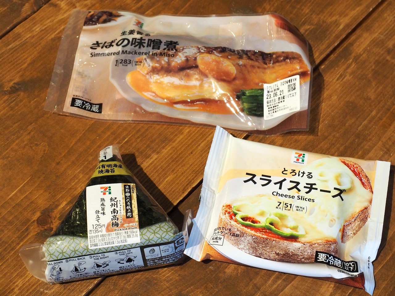まずはさばの味噌煮。セブンのパウチが美味しいんですがもちろん缶のモノでもOK。で、おにぎりは紀州南高梅。これは絶対コレがオススメ。それと「とろけるスライスチーズ」の3つ。たったコレだけ。
