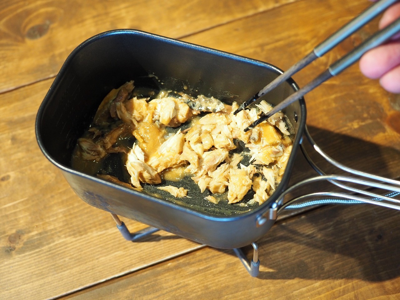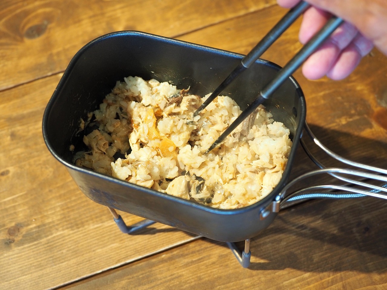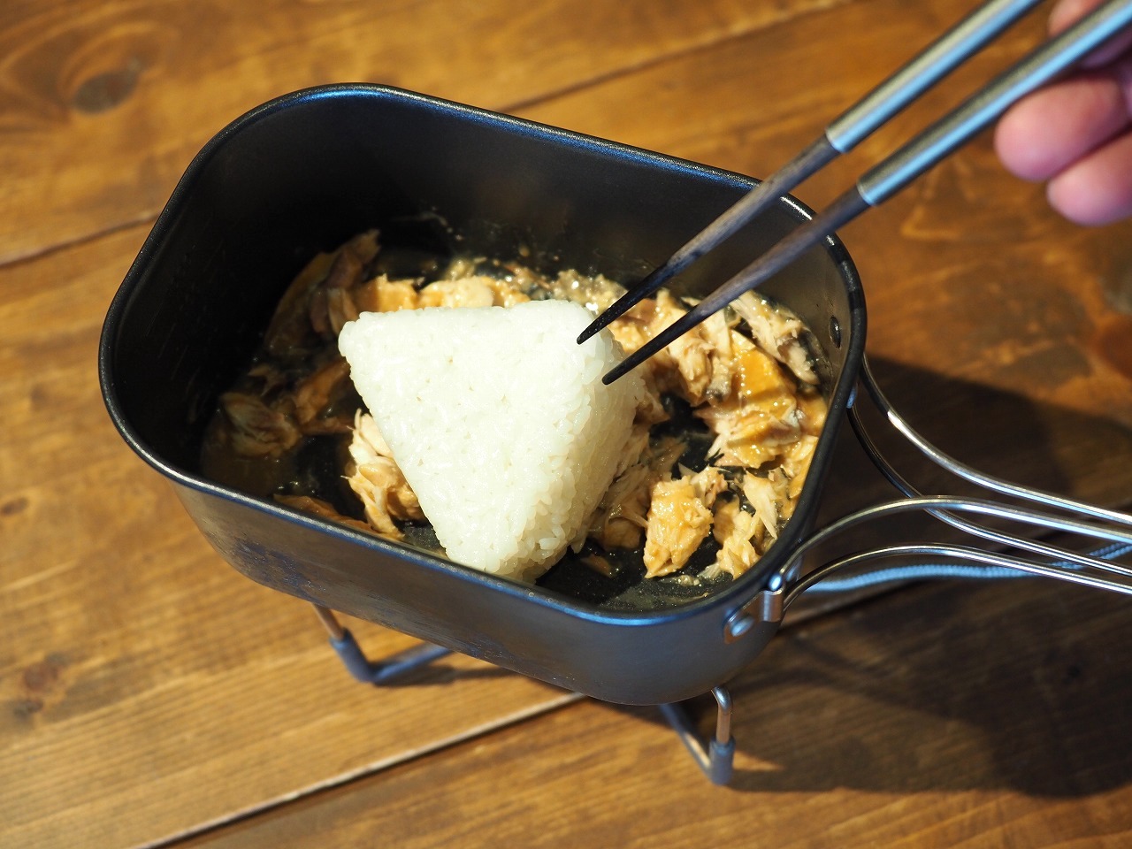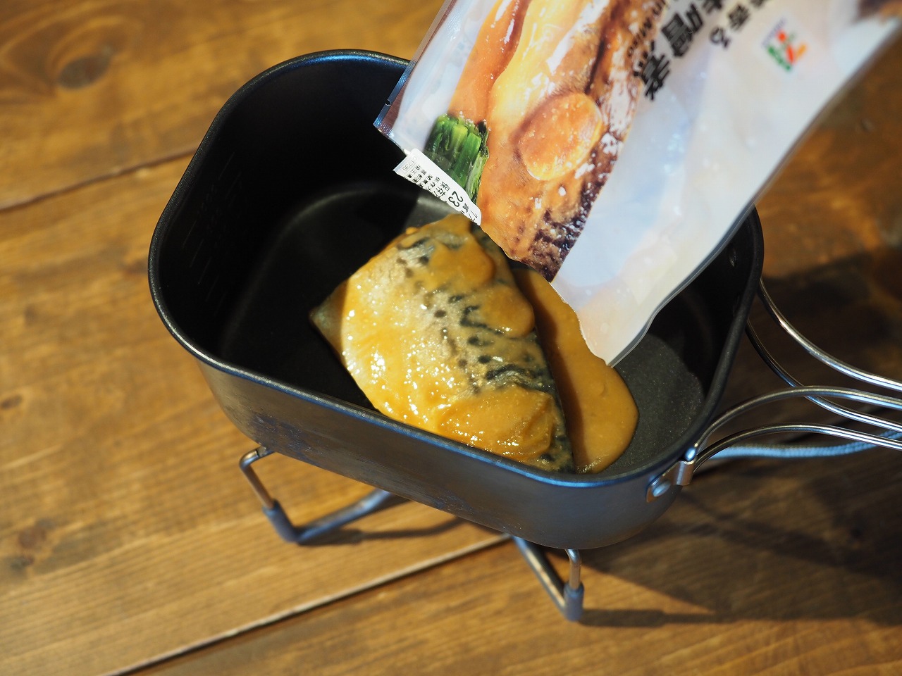 もちろんのように今回もフライパンとコッヘルふたつ使います。ふたつ火にかけられるコッヘルがあれば何でもOK。いつものようにPaaGo WorksのTrail Potを使っていますが、今までと少し使う順番が違います。