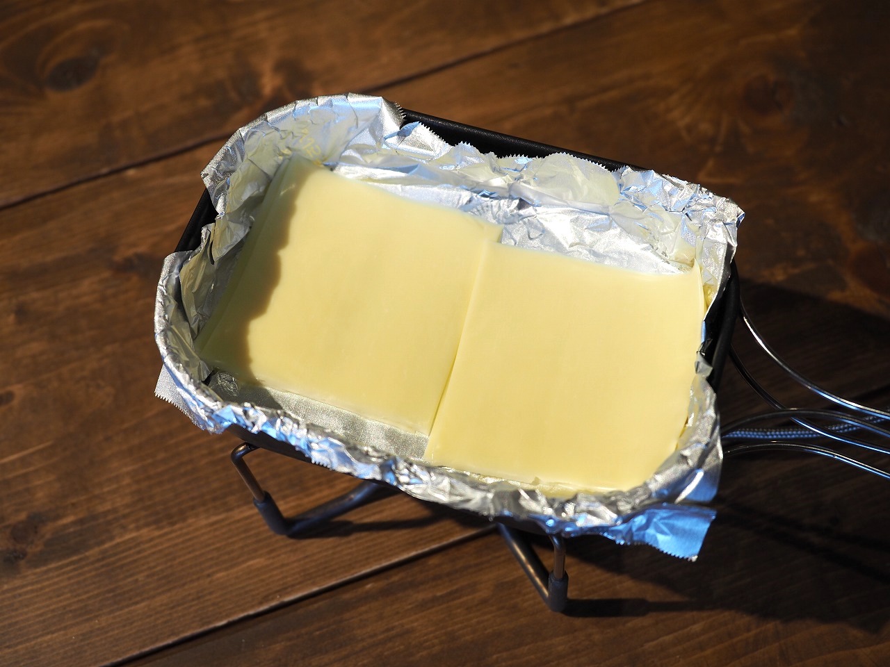 今回はフライパンにテフロン加工のアルミホイル敷いてからスライスチーズをのせます。2枚がオススメですが、チーズタップリな4枚でもイイです。