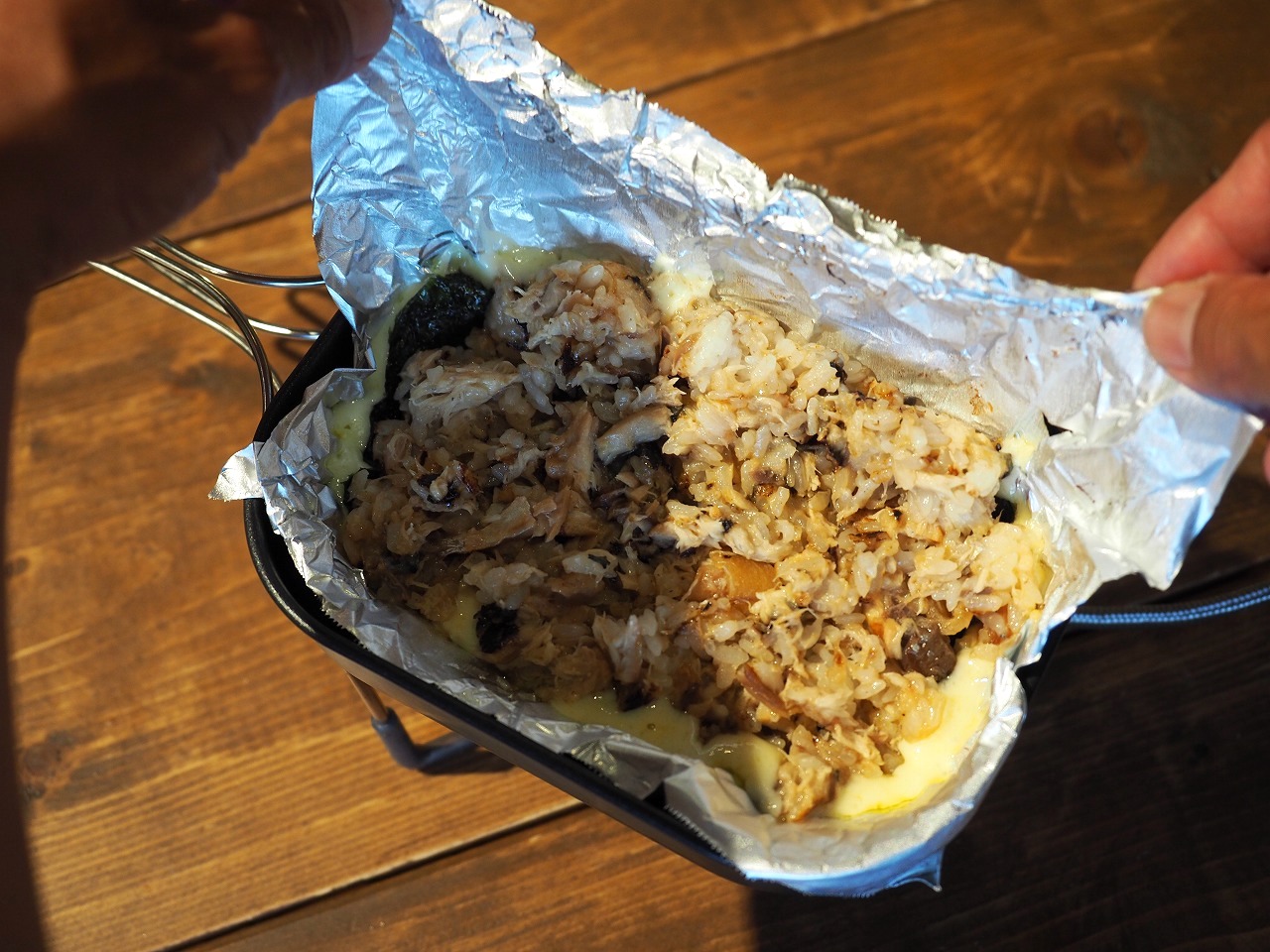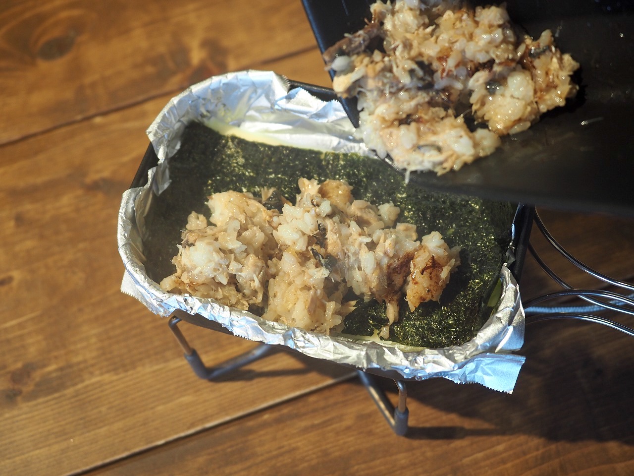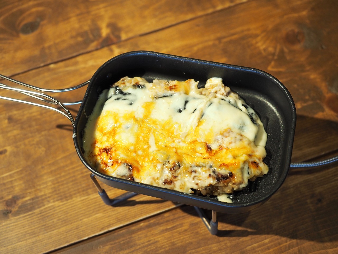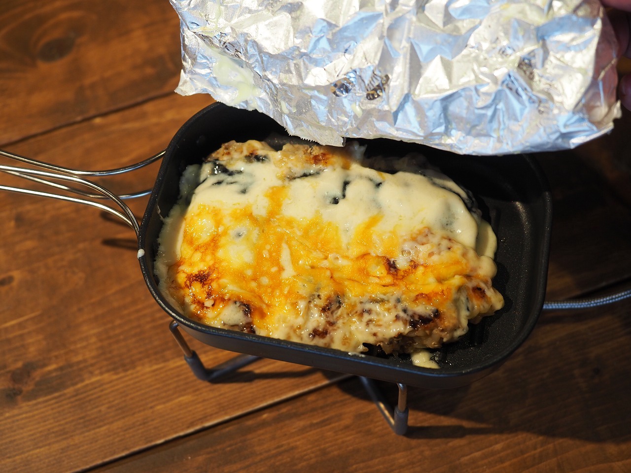 ワタシはいままでトレイルポットの使い方を間違えていました。フライパンでテフロンアルミホイルを使ってチーズと中身を加熱して、最後にひっくり返すというのがドリア系レシピの正しいオペレーションだったのです!!